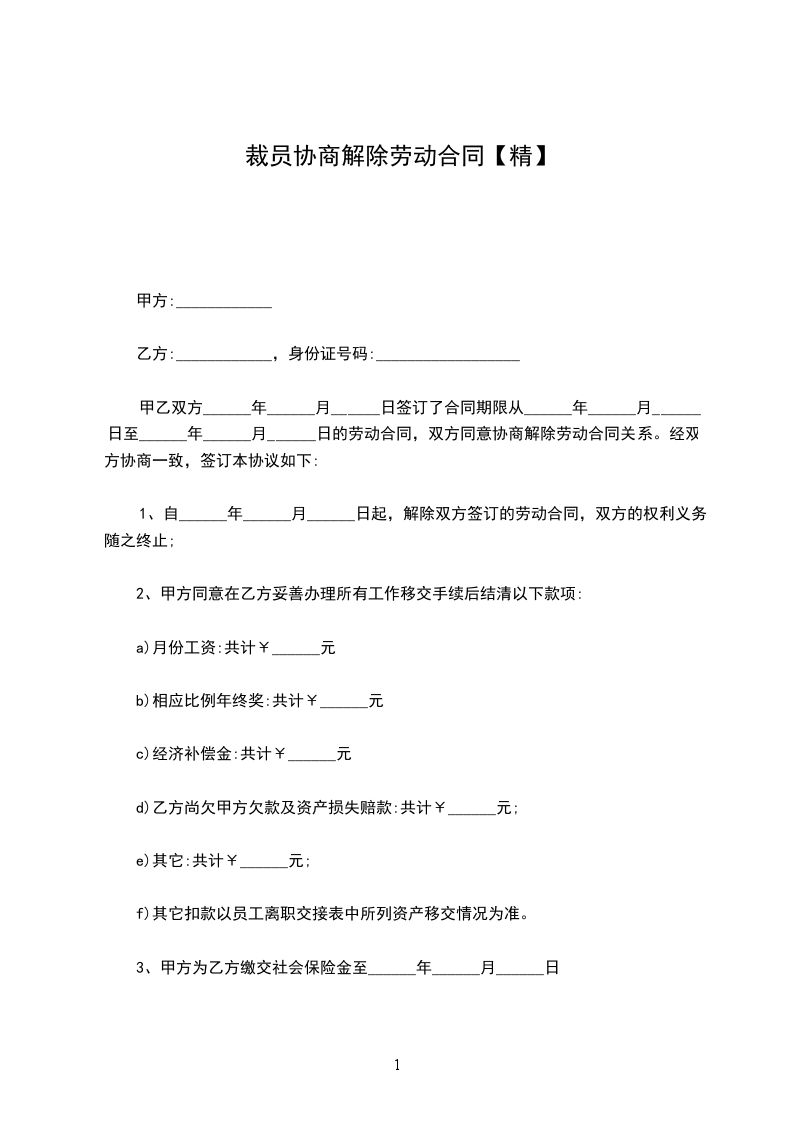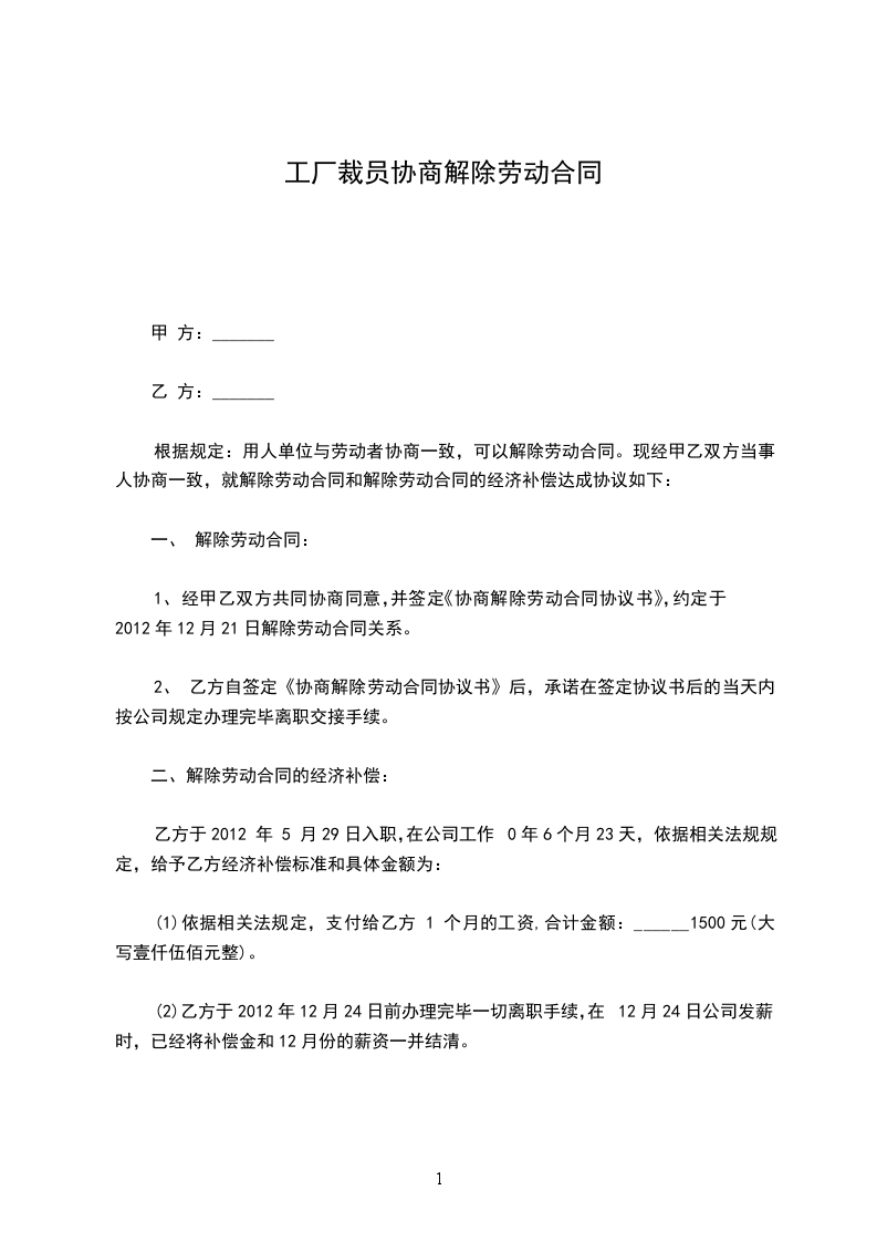 1、自______年______月______日起,解除双方签订的劳动合同,双方的权利义务随之终止;