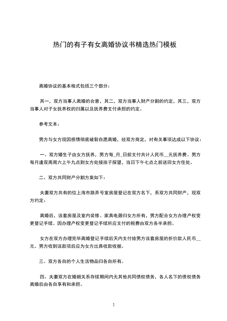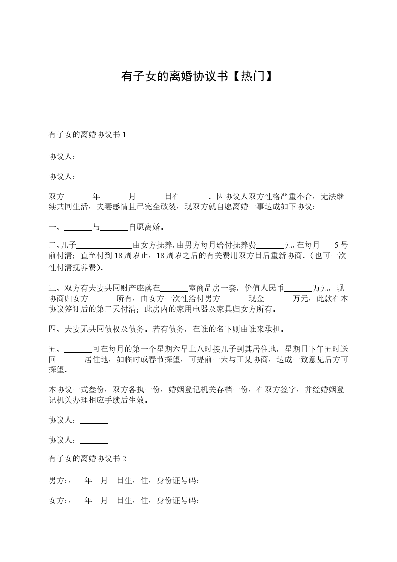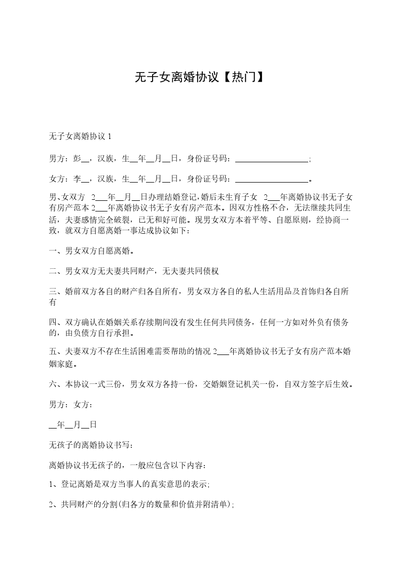 男方王__与女方赵______年__月认识,__年__月__日在____登记结婚,婚后__年__月__日生育一儿子/女儿,名______.因____致使夫妻感情破裂,已无和好可能,现经夫妻双方自愿协商达成一致意见,订立离婚协议如下:
