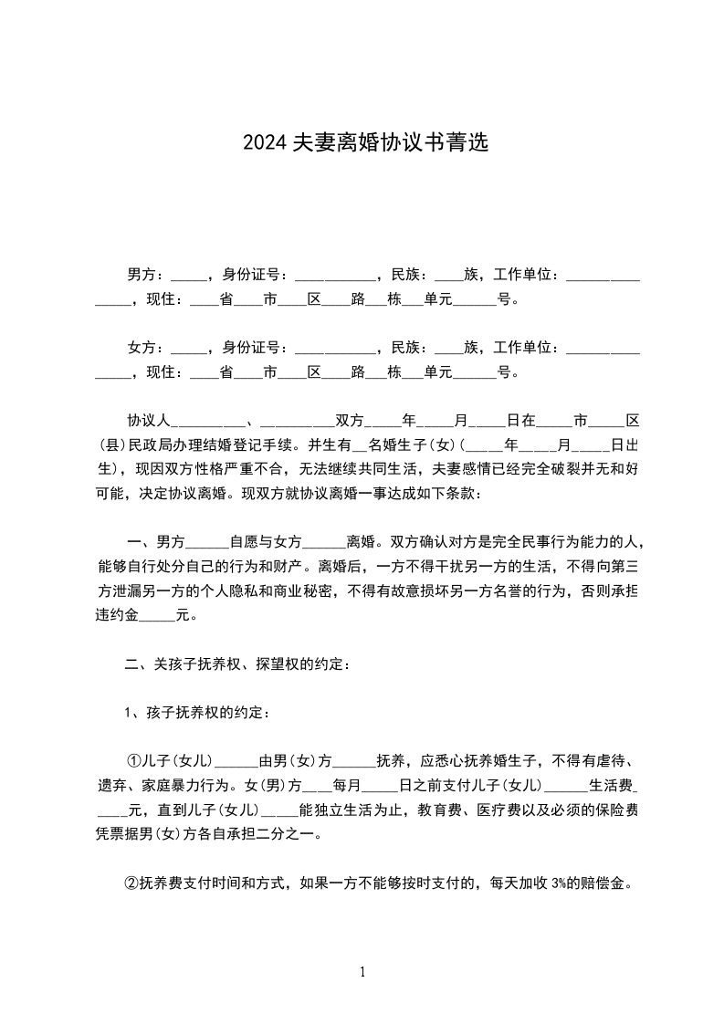 14、本协议书一式三份,甲乙双方各执一份,婚姻登记部门保留一份。