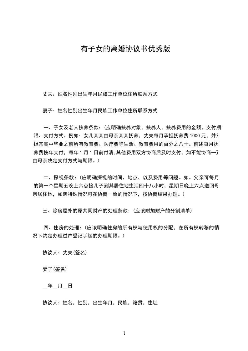 一、子女及老人扶养条款:(应明确扶养对象,扶养人,扶养费用的金额、支付期限、支付方式。例如:女儿某某由母亲某某抚养,丈夫每月承担抚养费1000元,并承担其高中毕业之前所有教育费、医疗费等生活、教育费用的百分之八十。前述每月抚养费按年支付,每年1月1日前付清;其他费用双方协商后及时支付,如不能协商一致,由母亲决定支付方式与期限。)