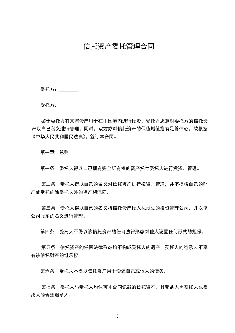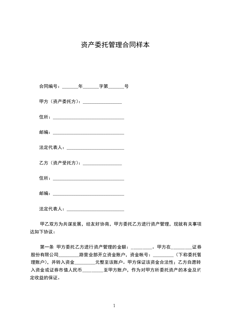 第一条 甲方委托乙方进行资产管理的金额:_________。甲方在_________证券股份有限公司_________路营业部开立资金账户,资金帐号:_________(下称委托管理账户),并转入资金_________元整至该账户。甲方保证该资金合法性;乙方自愿转入资金或证券市值人民币_________至甲方账户,作为对甲方所委托资产的本金及约定收益的保证。