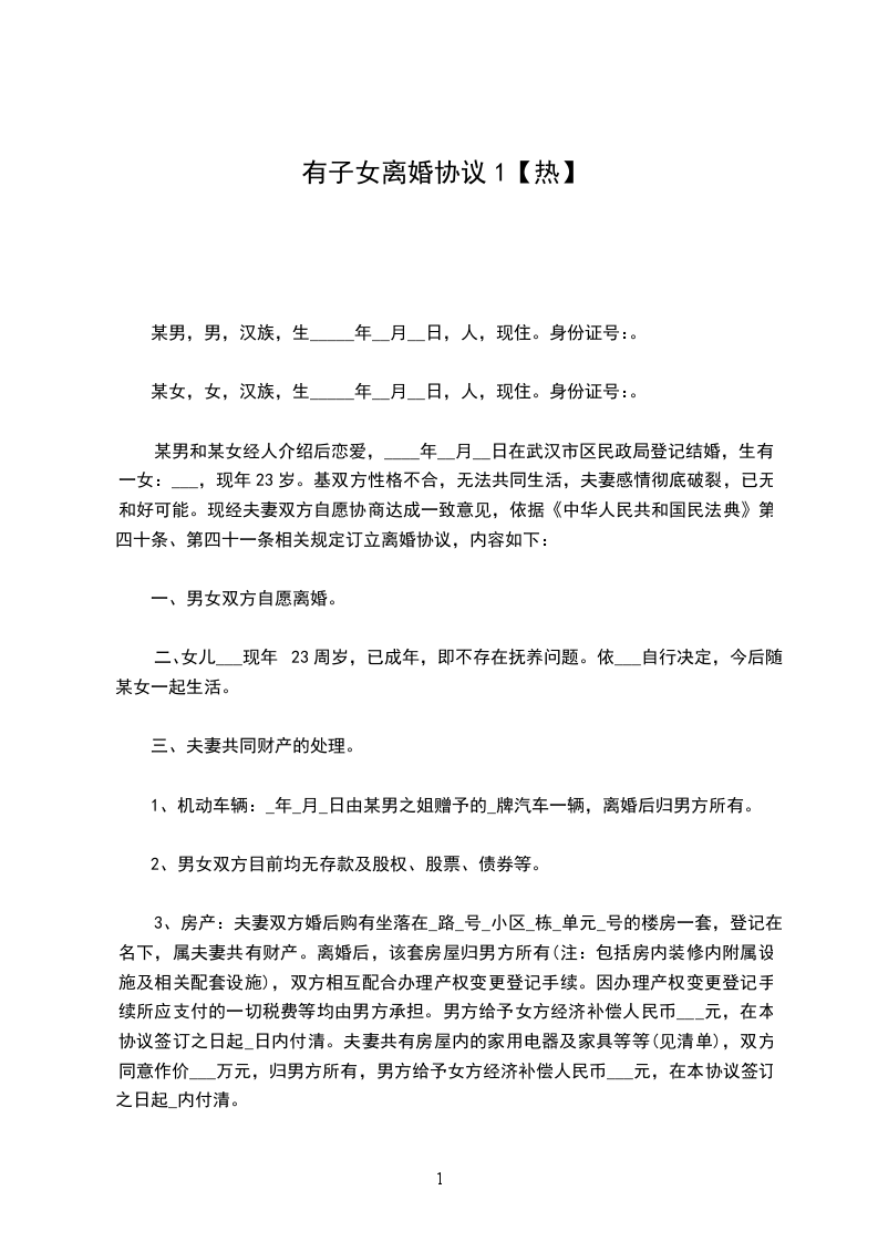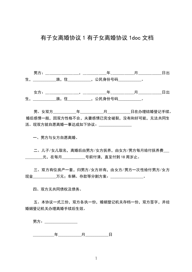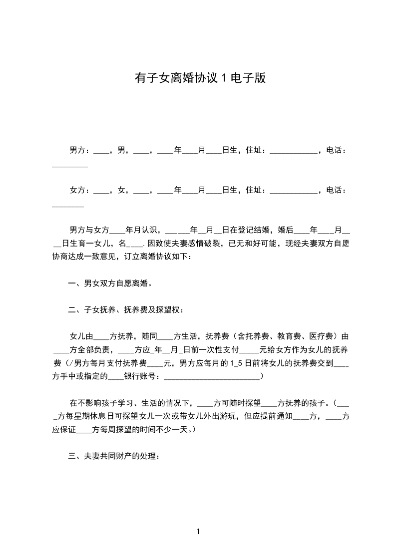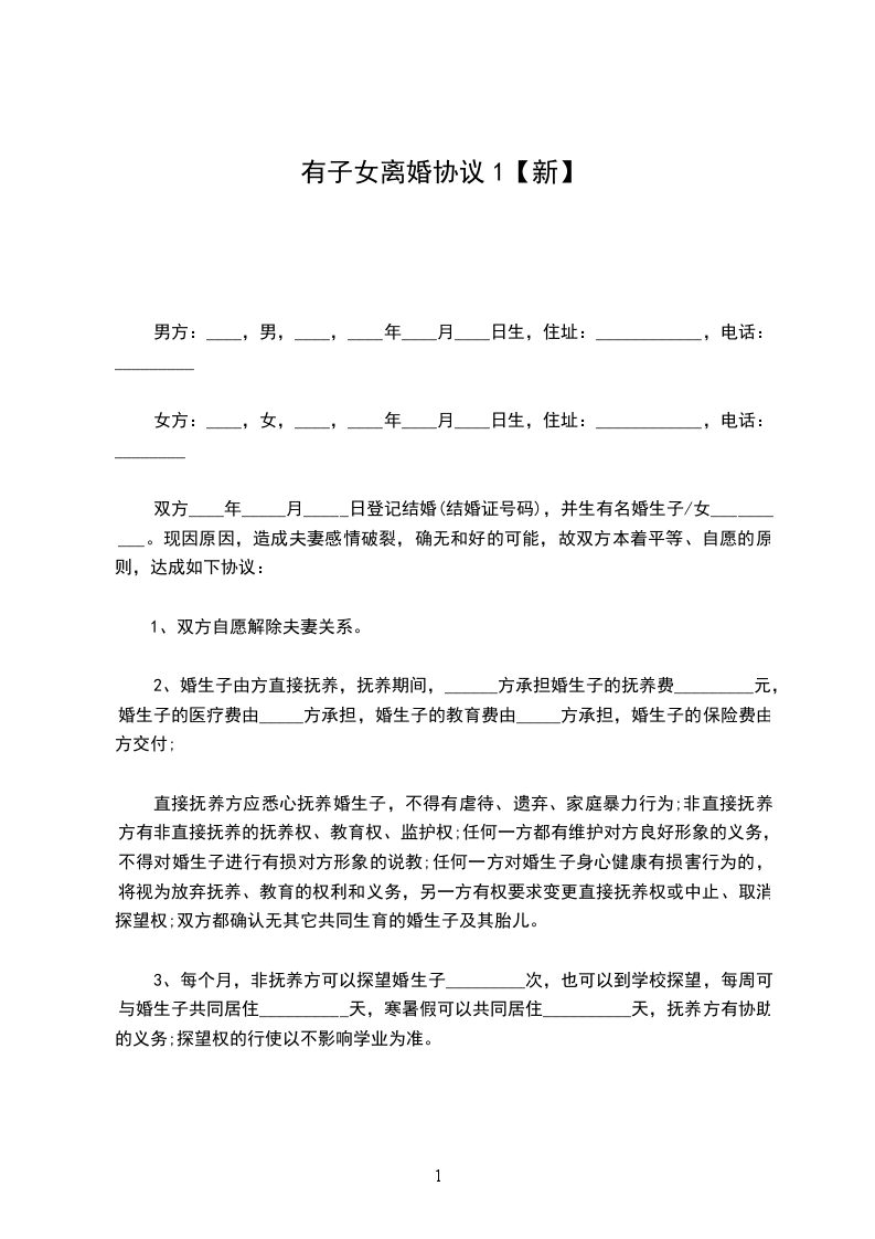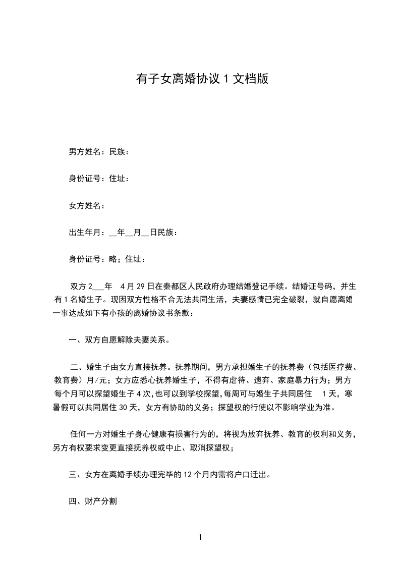 双方2___年 4月29日在秦都区人民政府办理结婚登记手续。结婚证号码,并生有1名婚生子。现因双方性格不合无法共同生活,夫妻感情已完全破裂,就自愿离婚一事达成如下有小孩的离婚协议书条款: