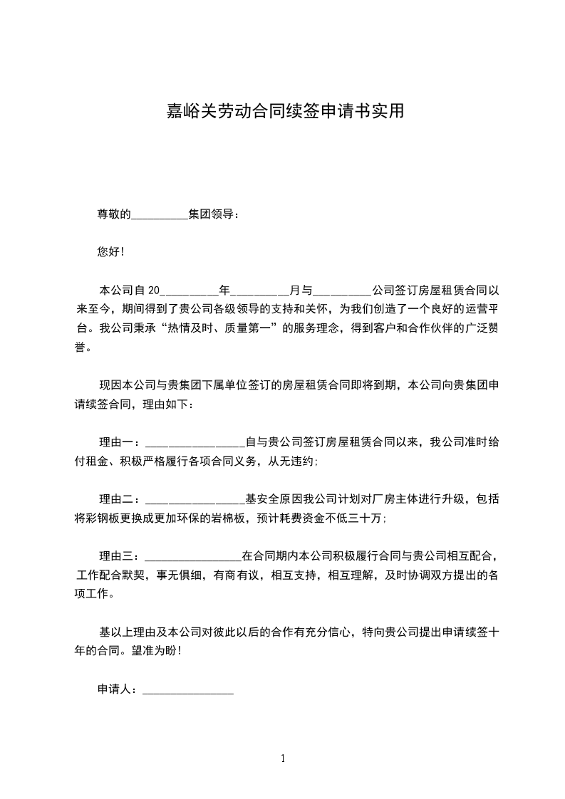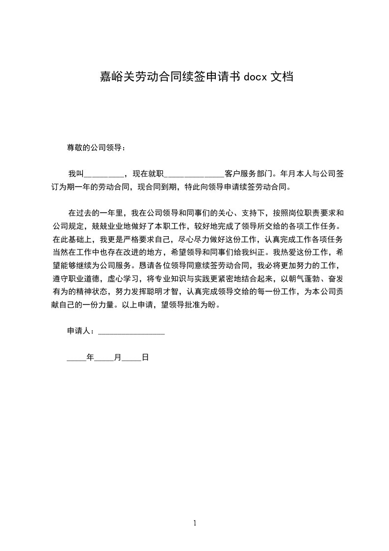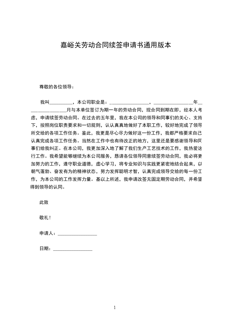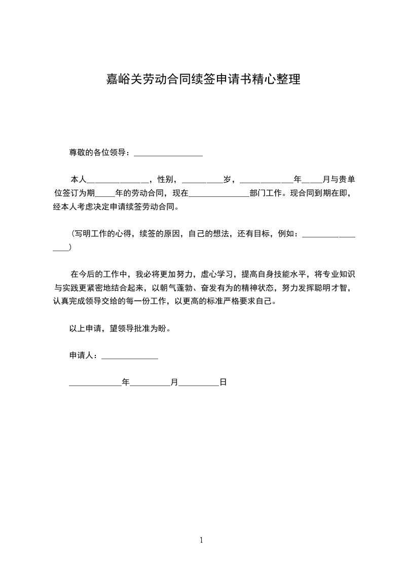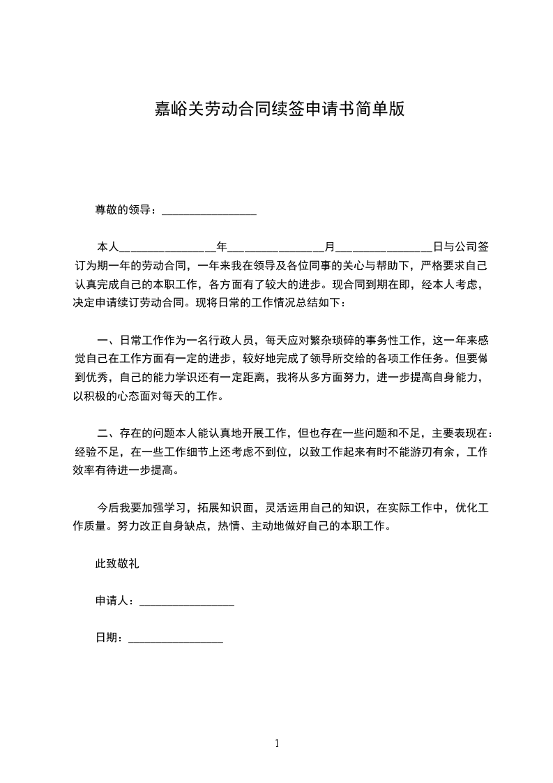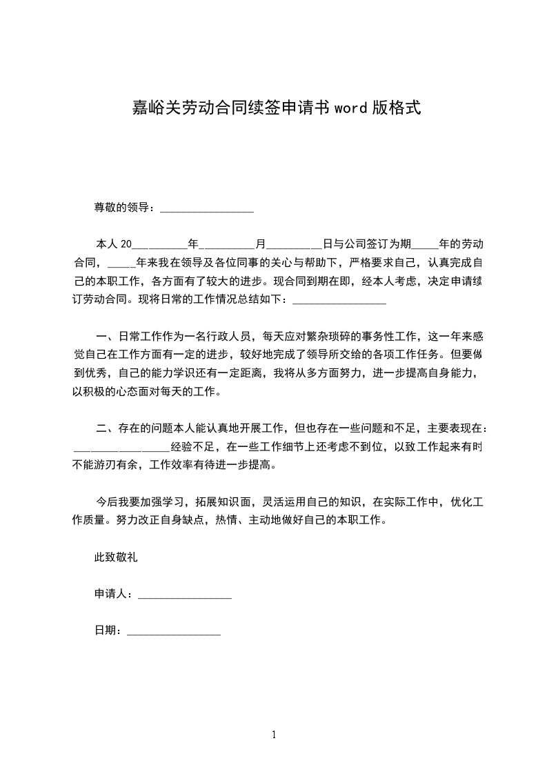 本人_________________年_________________月_________________日与公司签订为期一年的劳动合同,一年来我在领导及各位同事的关心与帮助下,严格要求自己,认真完成自己的本职工作,各方面有了较大的进步。现合同到期在即,经本人考虑,决定申请续订劳动合同。现将日常的工作情况总结如下: