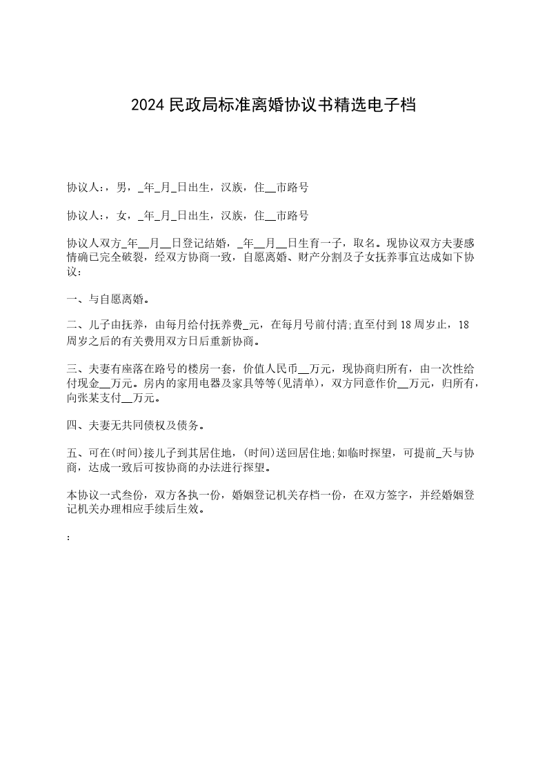 协议人双方_年__月__日登记结婚,_年__月__日生育一子,取名。现协议双方夫妻感情确已完全破裂,经双方协商一致,自愿离婚、财产分割及子女抚养事宜达成如下协议: