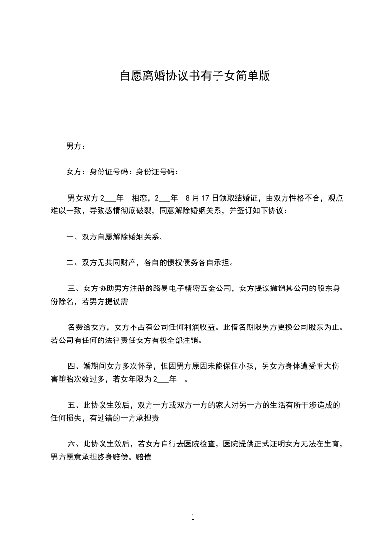 男女双方2___年 相恋,2___年 8月17日领取结婚证,由双方性格不合,观点难以一致,导致感情彻底破裂,同意解除婚姻关系,并签订如下协议: