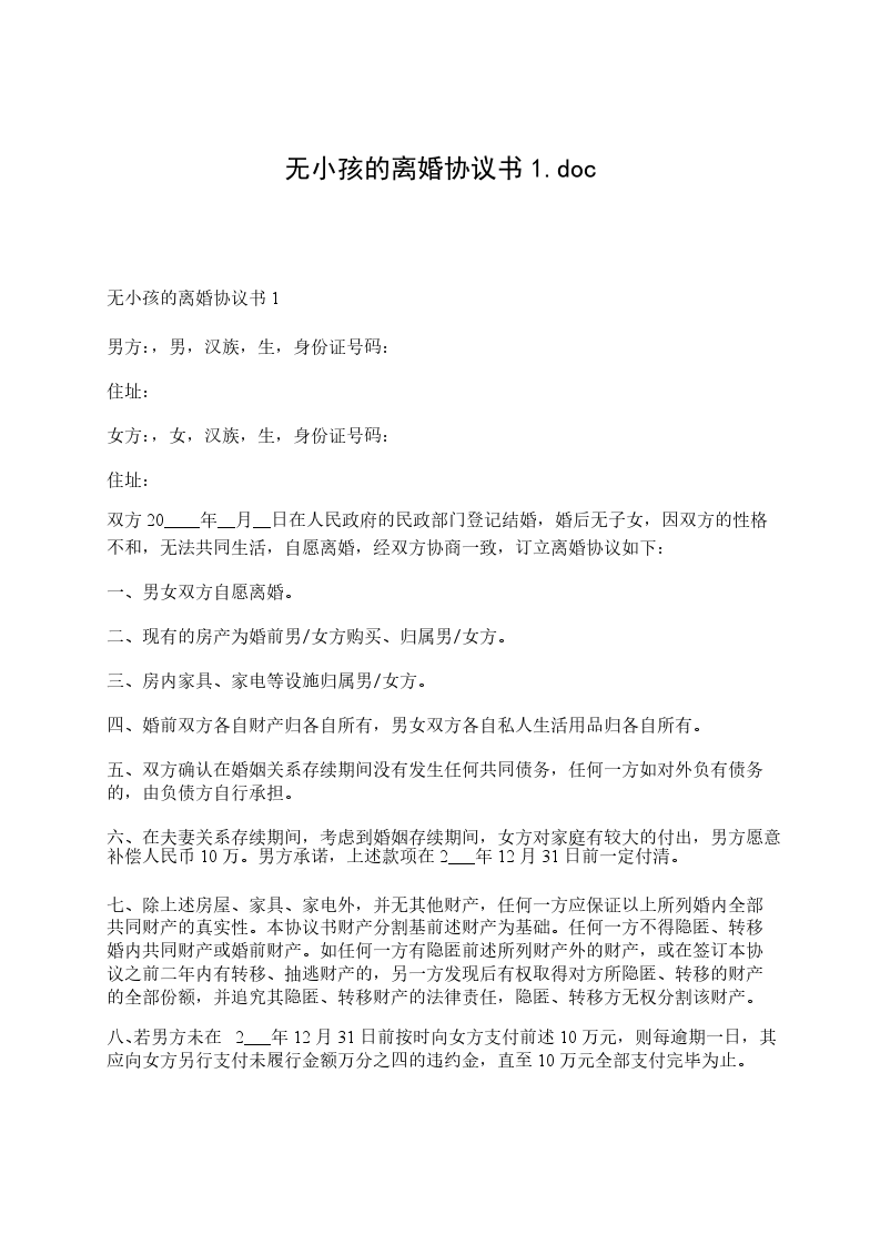 无小孩的离婚协议书2男方:,男,汉族,生,身份证号码: