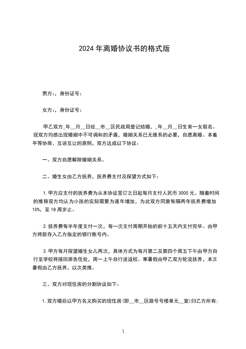 1.双方婚后以甲方名义购买的现住房(即__市__区路号号楼单元__室)归乙方所有;