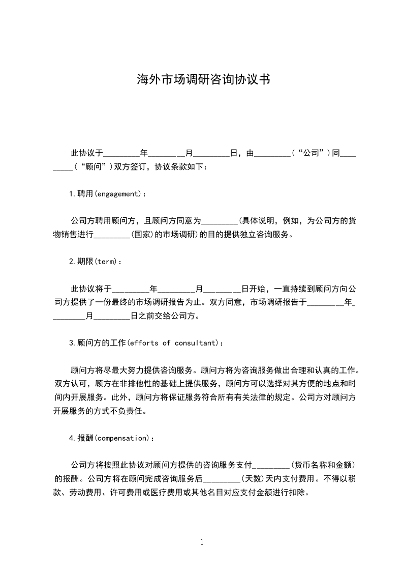 公司方聘用顾问方,且顾问方同意为_________(具体说明,例如,为公司方的货物销售进行_________(国家)的市场调研)的目的提供独立咨询服务。