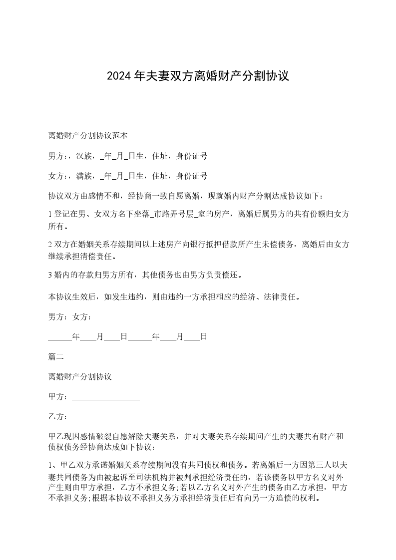 1.存款:双方名下现有银行存款共____________元,双方各分一半,为______元。分配方式:各自名下的存款保持不变,但男方/女方应______年______月______日前一次性支付______元给女方/男方。