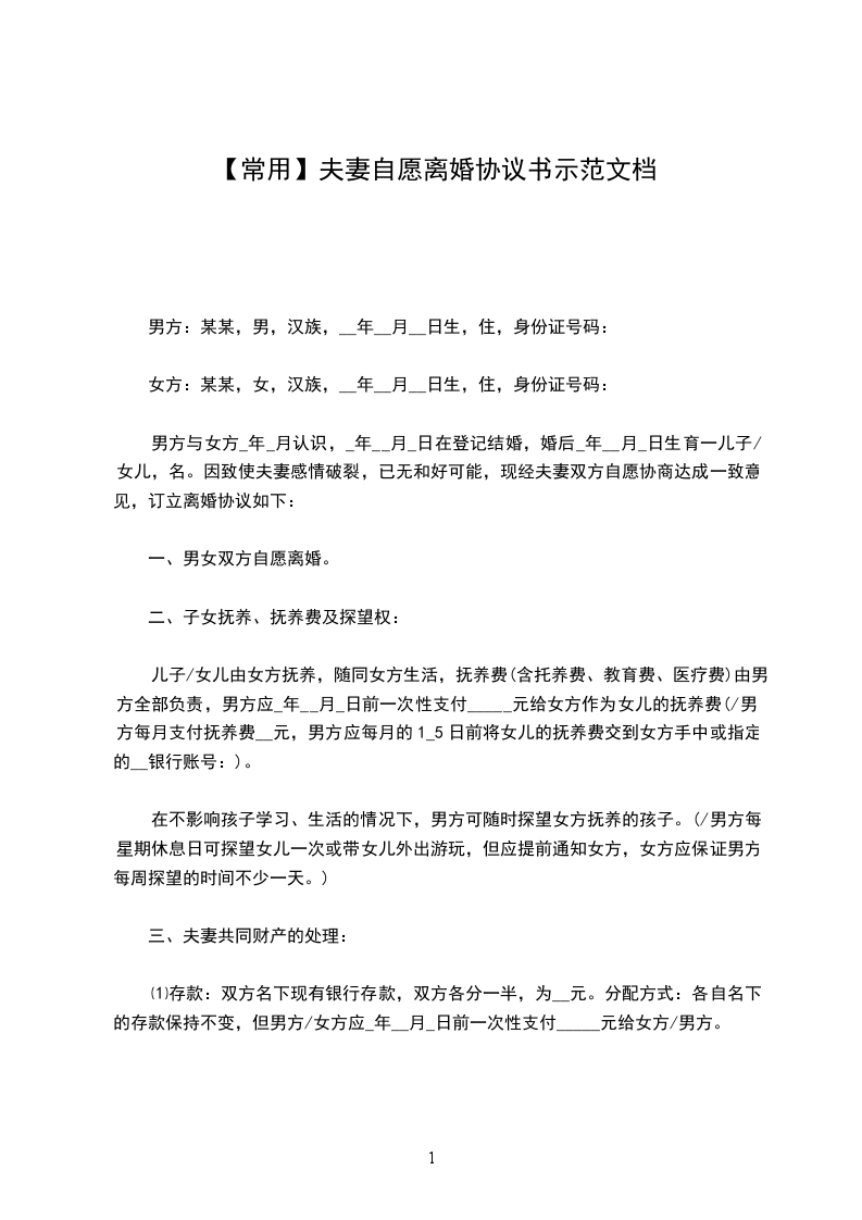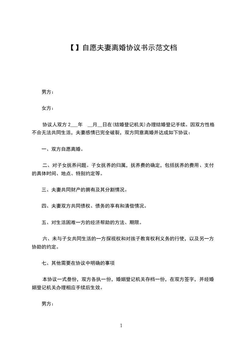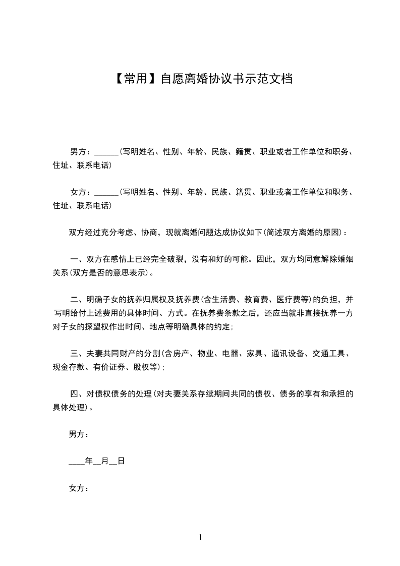 男方:______(写明姓名、性别、年龄、民族、籍贯、职业或者工作单位和职务、住址、联系电话)