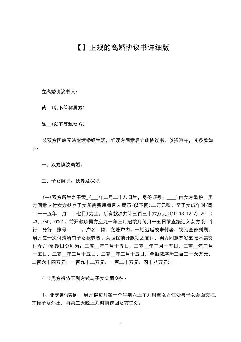 (一)双方所生之子黄_(___年二月二十八日生,身份证号:____)由女方监护。男方同意支付女方扶养子女所需费用每月人民币(以下同)二万元整,至子女成年时(即二一一五年二月二十七日)为止,所有款项共计三百三十六万元((10 13_12 2)_20__0=3,360,000)。前开款项男方应九一年三月起按月每月十五日前直接汇入女方设__银行__分行,账号:____、户名:陈__之账户内。一期迟延或未付者,视为全部到期,男方应一次付清所有子女扶养费。为担保前开款项之支付,男方同意签发五张本票交付女方(到期日分别为:二零__年三月十五日、二零__年三月十五日、二零__年三月十五日、二零__年三月十五日、二零__年三月十五日,金额依序为三百三十六万元、二百六十四万元、一百九十二万元、一百二十万元、四十八万元)。
