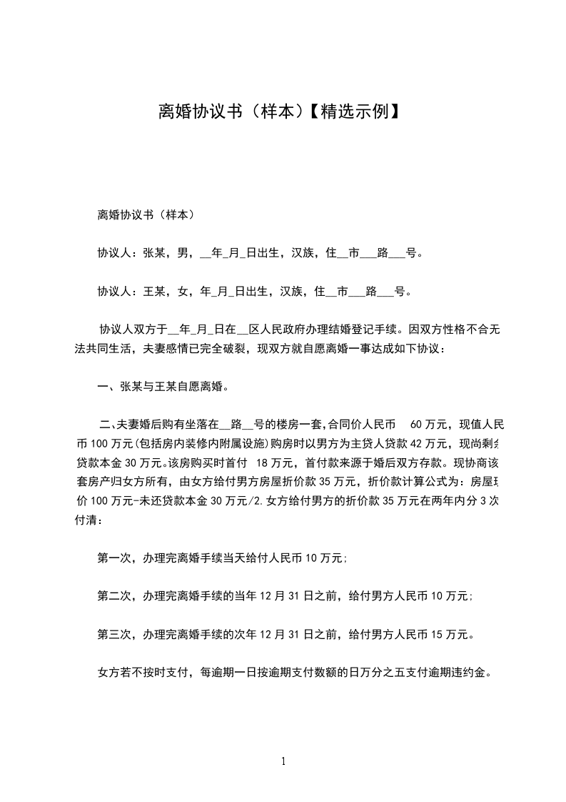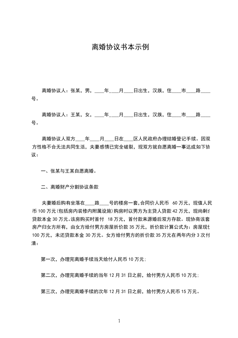(一)夫妻婚后购有坐落在____路____号的楼房一套,合同价人民币____万元,现值人民币______万元(包括房内装修内附属设施)。购房时以男方为主贷人贷款____万元,现尚剩余贷款本金____万元。该房购买时首付____万元,首付款来源婚后双方存款。现协商该套房产归女方所有,由女方给付男方房屋折价款____万元,折价款计算公式为:房屋现价____万元_未还贷款本金____万元/2、女方给付男方的折价款____万元在两年内分3次付清: