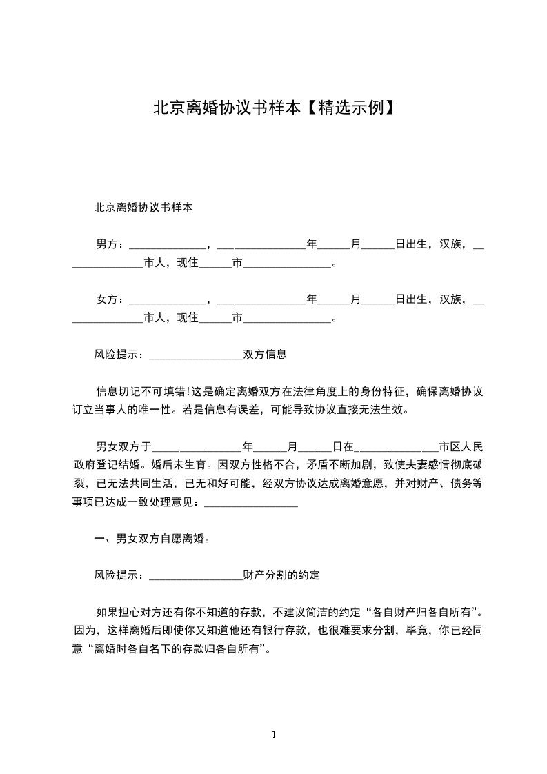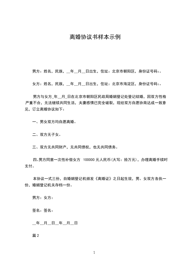 男方与女方_年__月_日在北京市朝阳区民政局婚姻登记处登记结婚,因双方性格严重不合,无法继续共同生活,夫妻感情已完全破裂,现经双方自愿协商达成一致意见,订立离婚协议如下:
