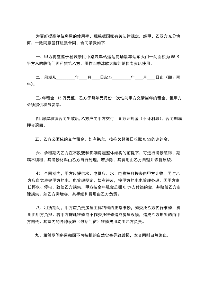 一、甲方将座落于县城亲民中路汽车站运达商场靠车站东大门一间面积为88.9平方米的临街门面租赁给乙方,用作四季沐歌太阳能销售专卖店使用。