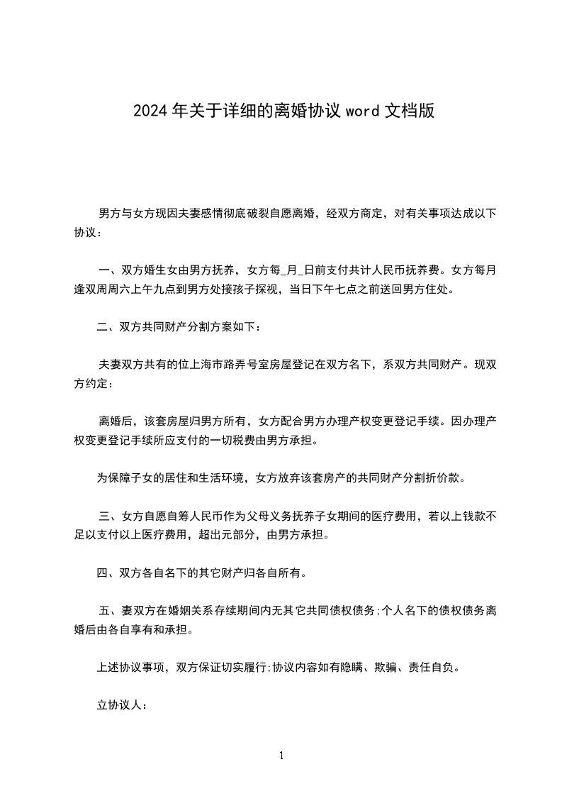 1、房产:a夫妻双方婚后购有坐落在____路____号____小区____栋____单元____号的楼房一套,登记在男方/女方(或双方)名下,属夫妻共有财产。离婚后,该套房屋归男方/女方所有(注:包括房内装修内附属设施及相关配套设施),双方相互配合办理产权变更登记手续。因办理产权变更登记手续所应支付的一切税费等均由男方/女方承担。取得房屋所有权的一方给予另一方经济补偿人民币________元,在本协议签订之日起____日内付清。