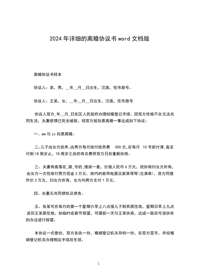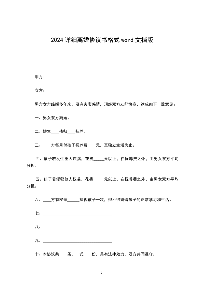 1、双方____年____月____日生育有一儿子/女儿,取名:________,离婚后儿子/女儿随男方/女方直接抚养生活,由女方/男方每月给付抚养费(包括生活费、教育费、医疗费)________元,在每月____号前付清,直到孩子完成高中教育阶段止。高中教育阶段之后的有关费用双方日后重新协商。