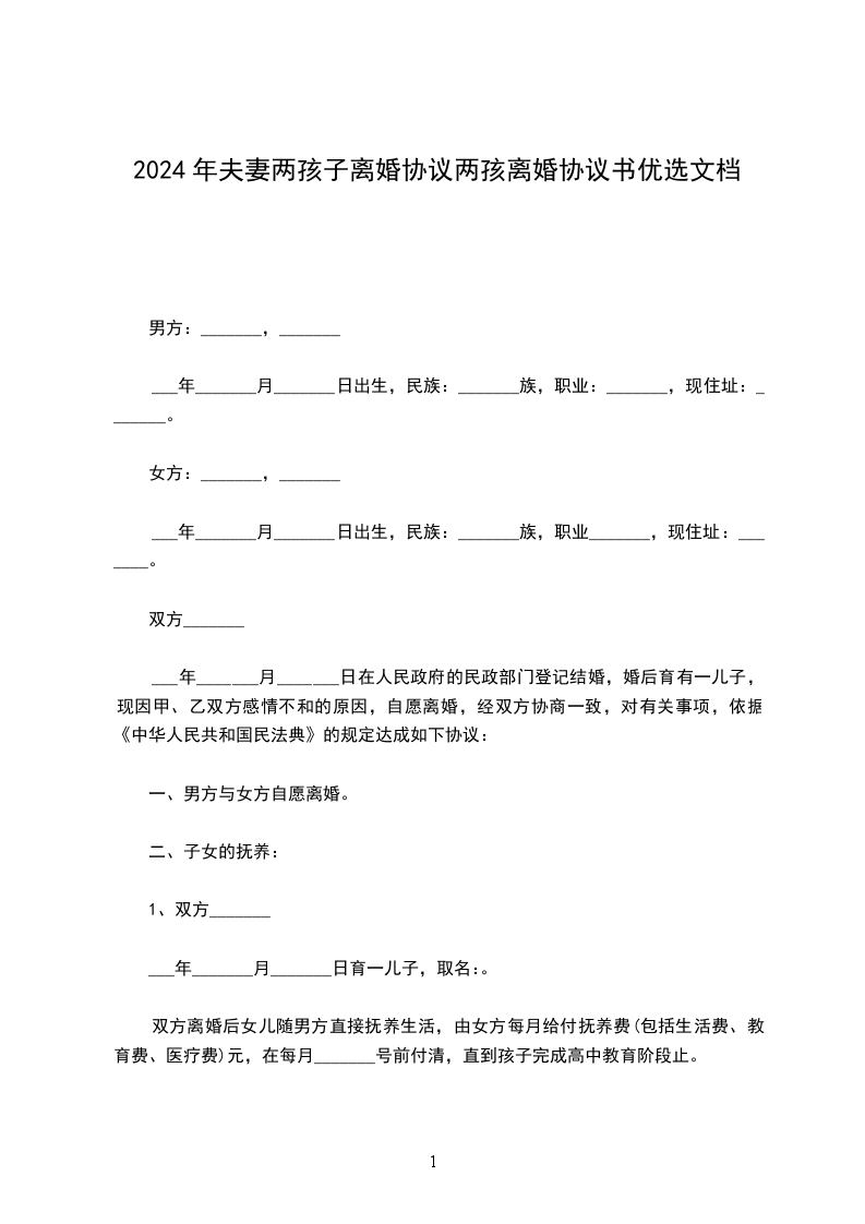1、双方________年____月____日生育有一儿子女儿,取名:,离婚后儿子女儿随男方女方直接抚养生活,由女方男方每月给付抚养费(包括生活费、教育费、医疗费)元,在每月号前付清,直到孩子完成高中教育阶段止。高中教育阶段之后的有关费用双方日后重新协商。