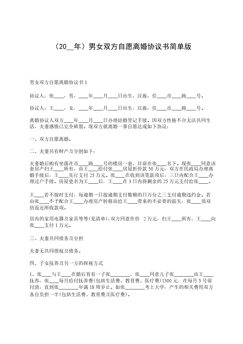 男女双方自愿离婚协议书1