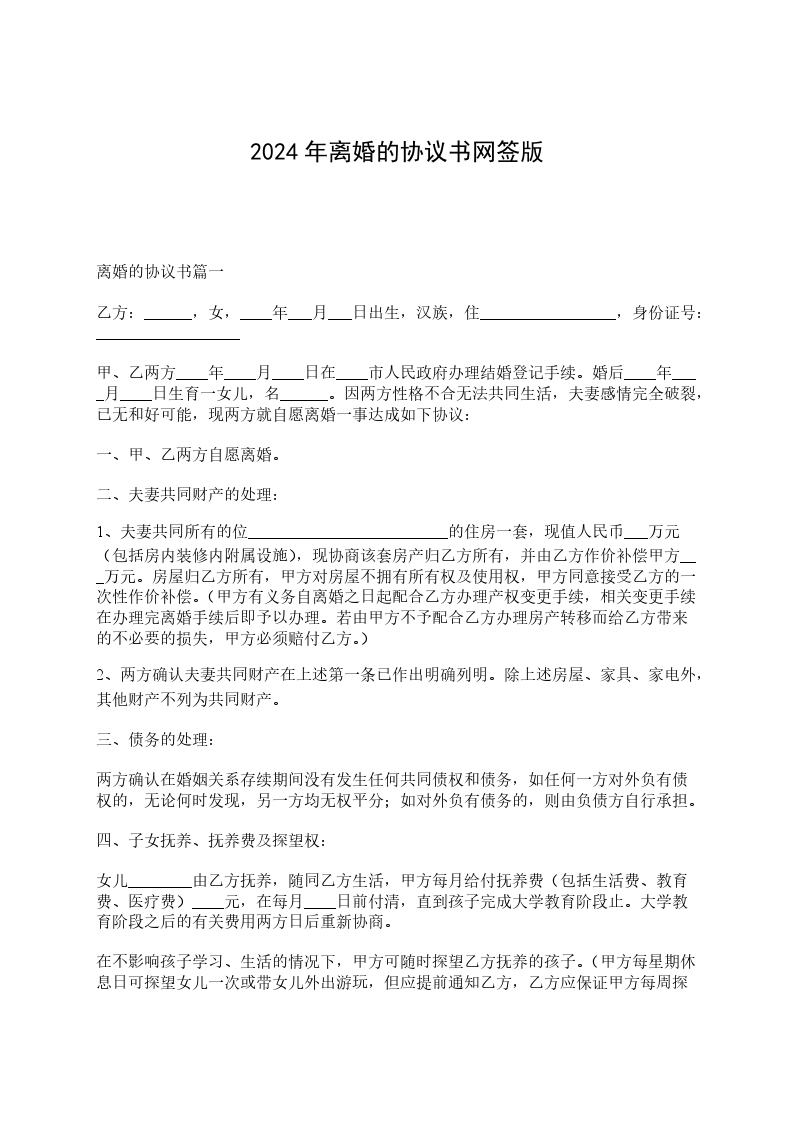 乙方:______,女,____年___月___日出生,汉族,住_________________,身份证号:__________________