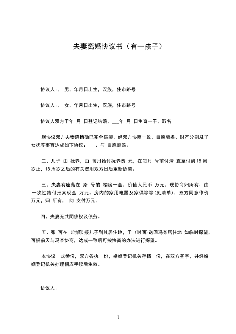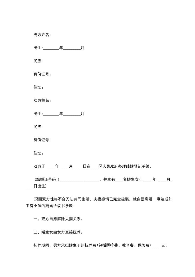 双方____年__月认识,____年__月__日在____登记结婚,婚后____年__月__日生育一儿子(女儿),名____。现夫妻感情已经完全破裂,没有和好可能,经双方协商达成一致意见,订立离婚协议如下: