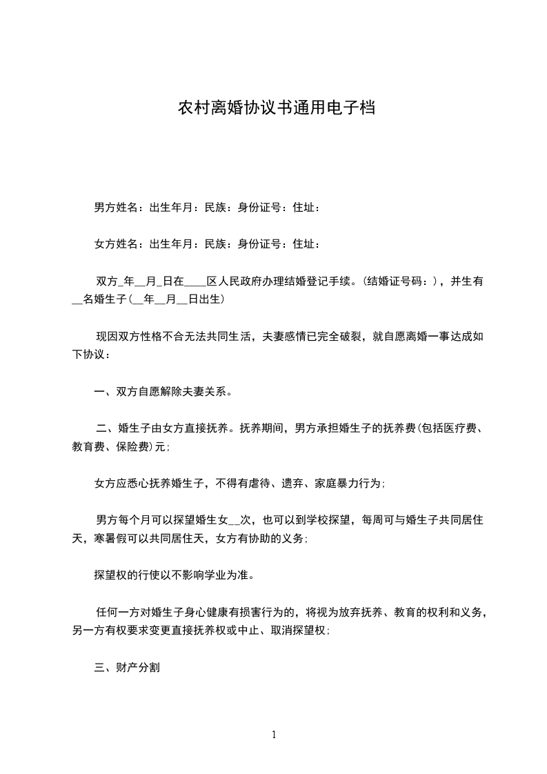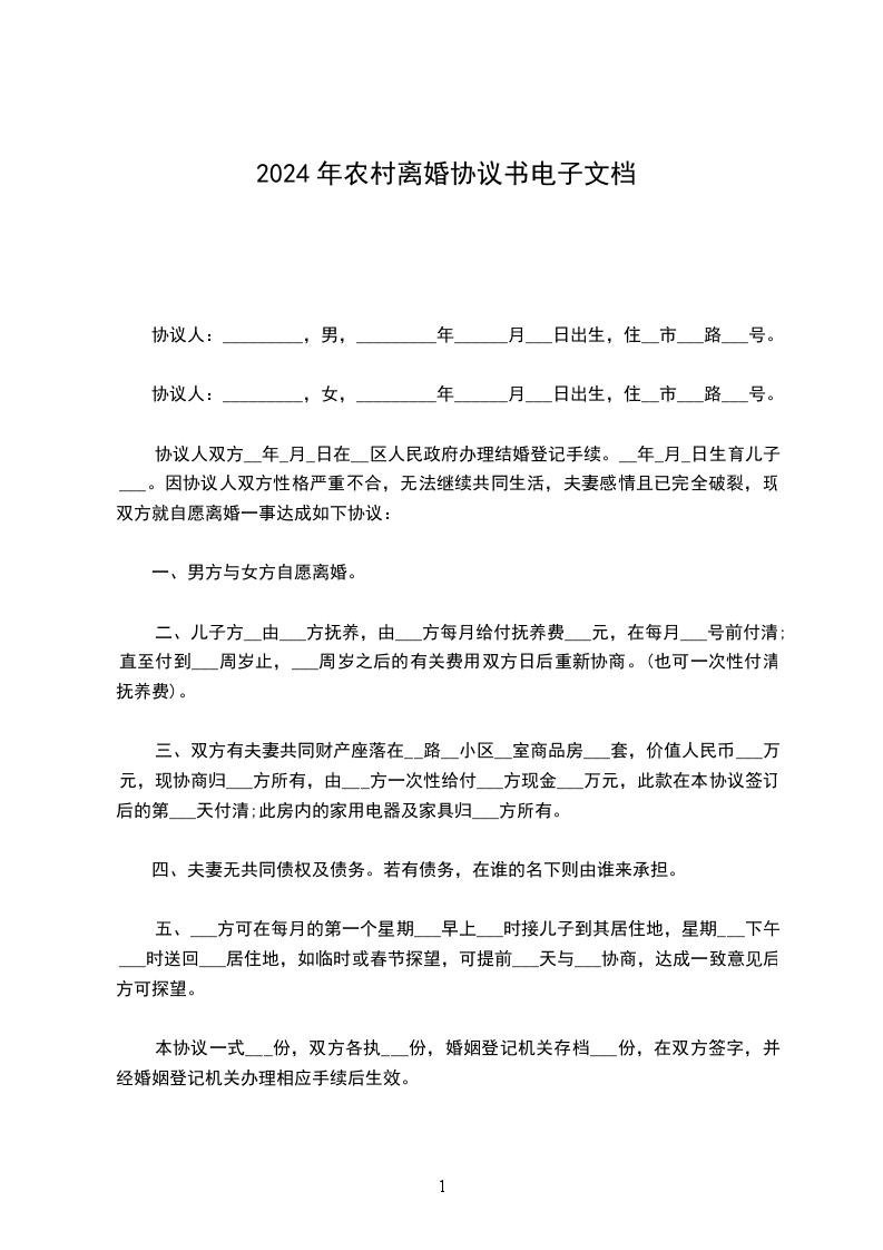 协议人:_________,男,_________年______月___日出生,住__市___路___号。