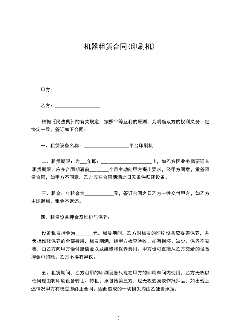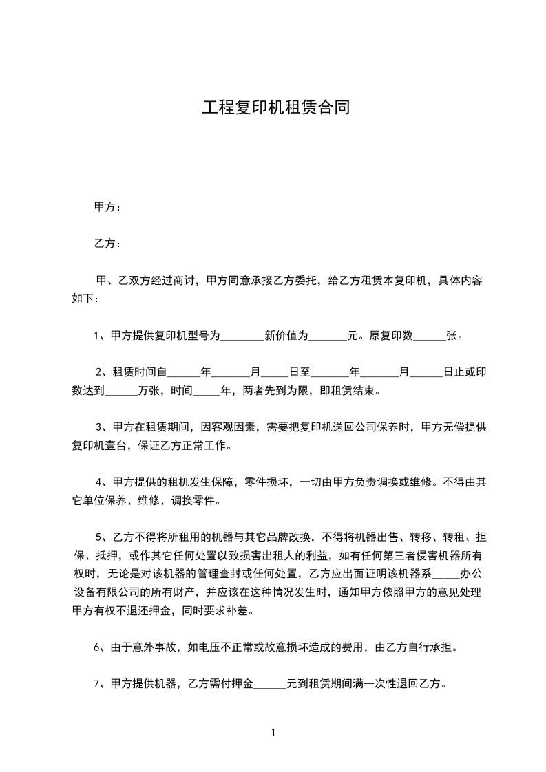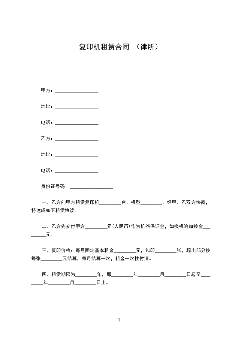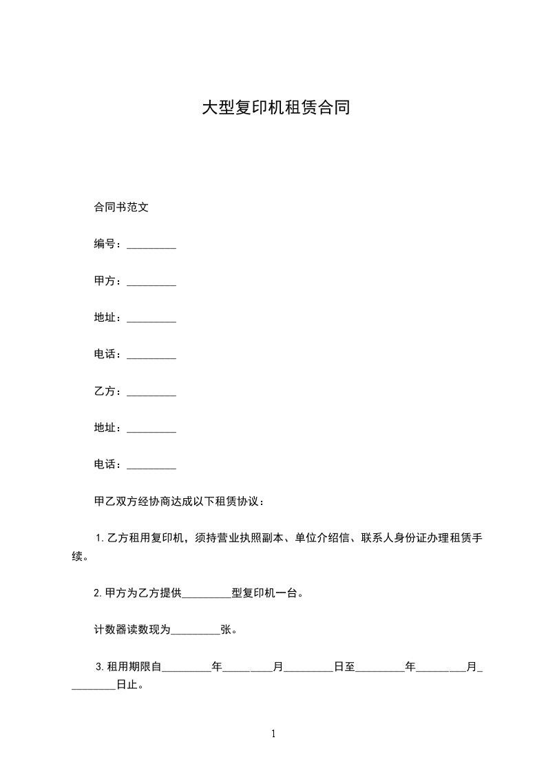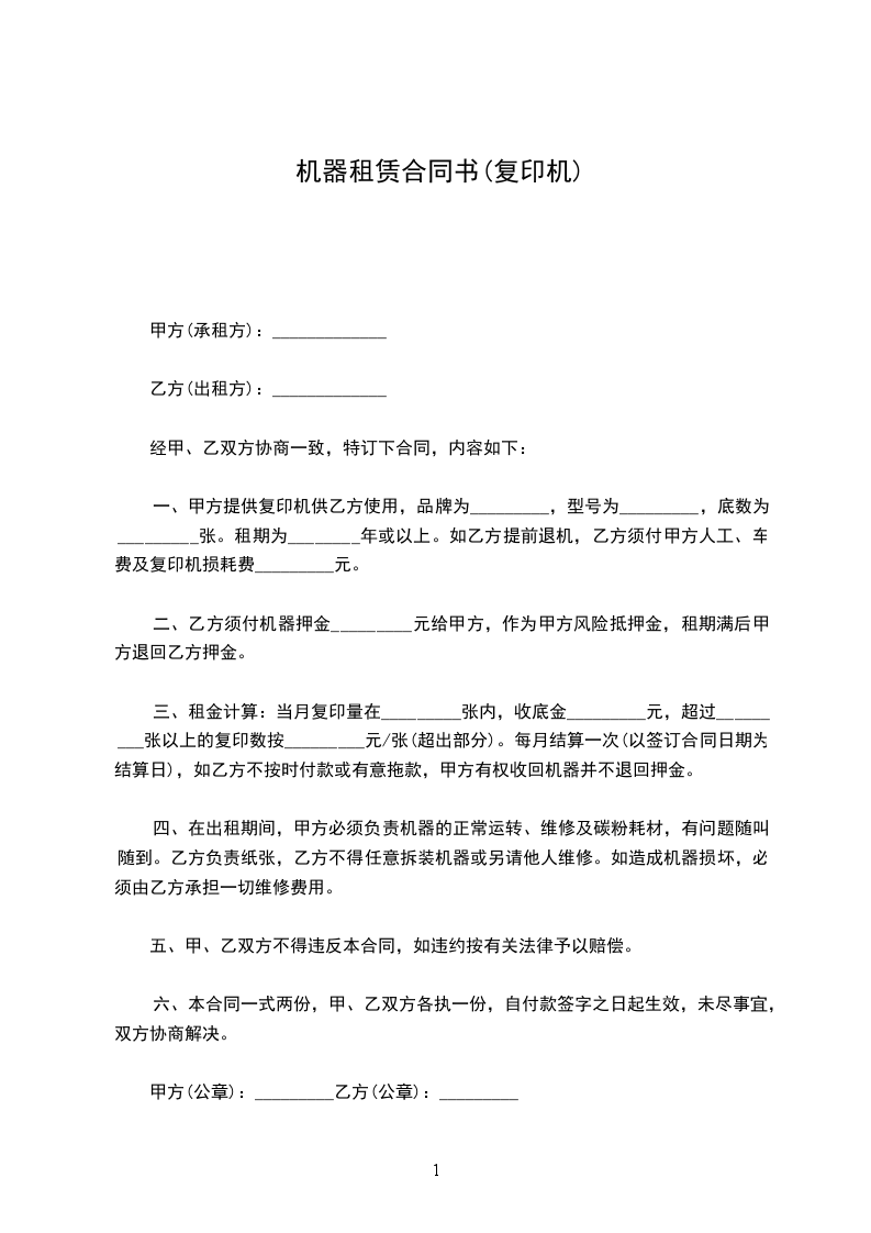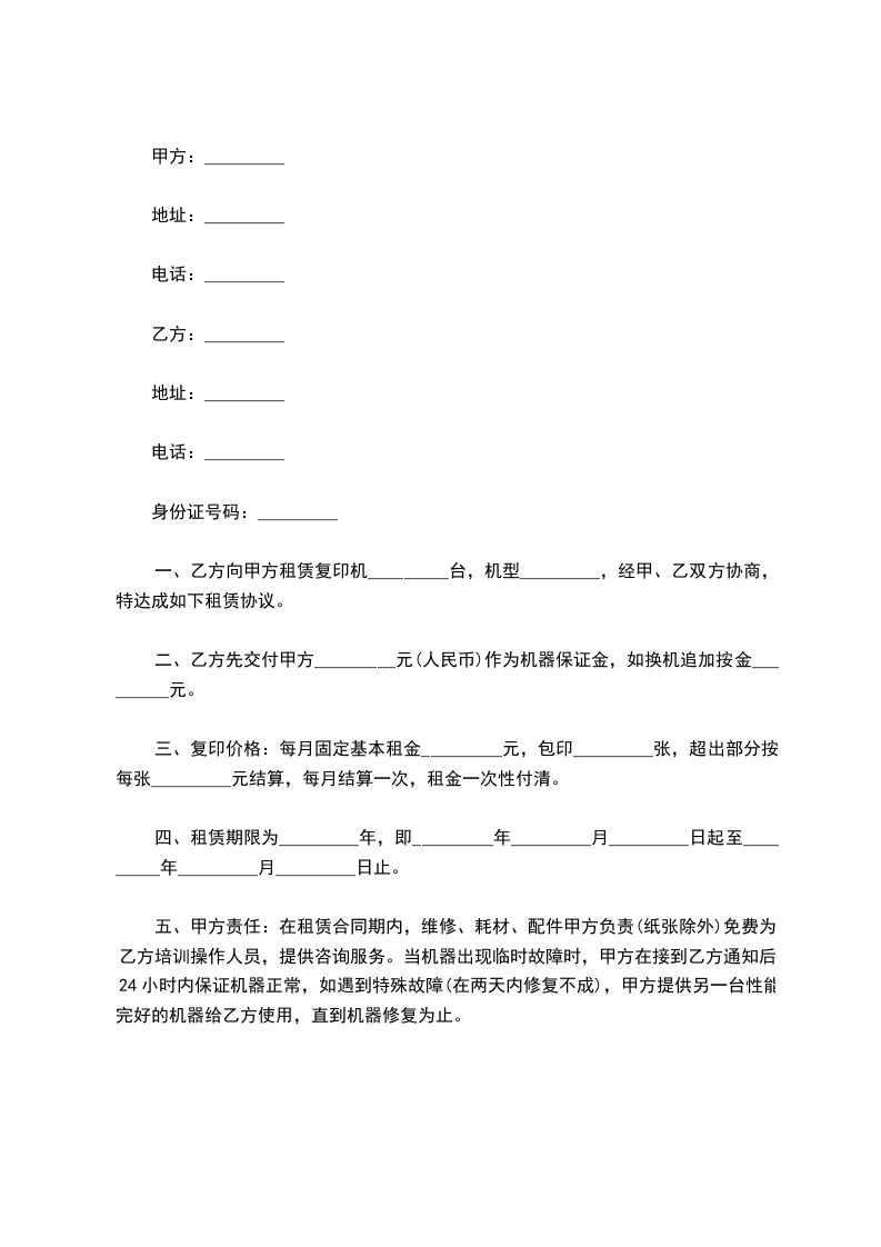 一、乙方向甲方租赁复印机_________台,机型_________,经甲、乙双方协商,特达成如下租赁协议。