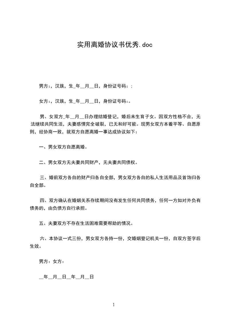 男、女双方_年__月__日办理结婚登记,婚后未生育子女。因双方性格不合,无法继续共同生活,夫妻感情完全破裂,已无和好可能。现男女双方本着平等、自愿原则,经协商一致,就双方自愿离婚一事达成协议如下: