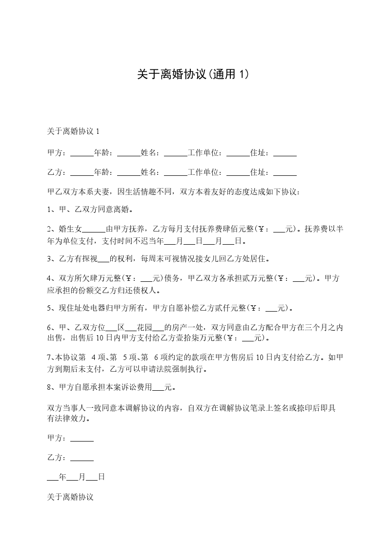 关于离婚协议甲方:___,男,____年__月__日出生,身份证号码:_________