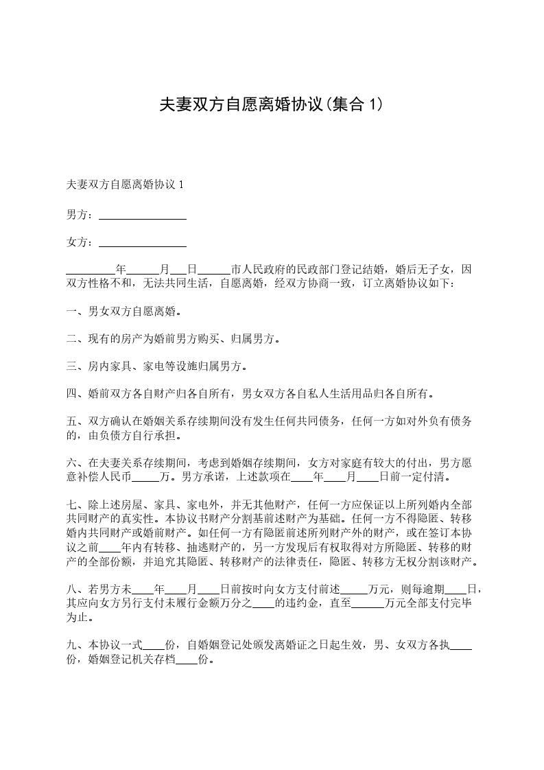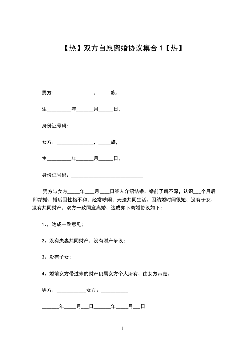 男方与女方___年___月认识,___年___月___日在___登记结婚,因_________________致使夫妻感情破裂,已无和好可能,现经夫妻双方自愿协商达成一致意见,订立离婚协议如下: