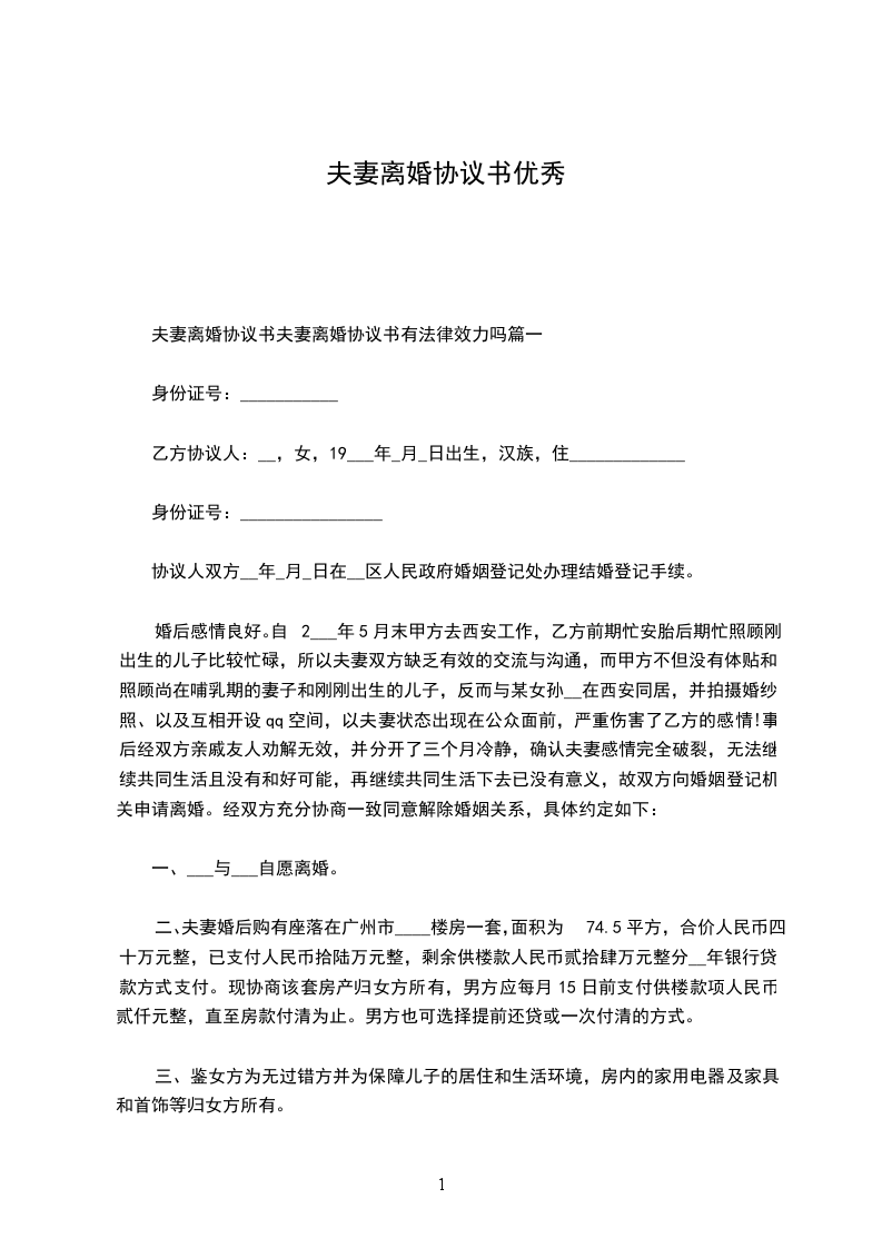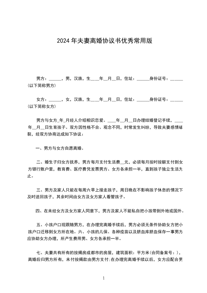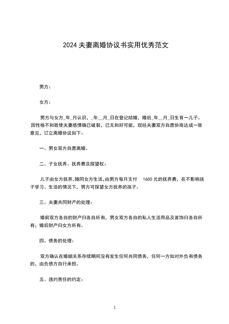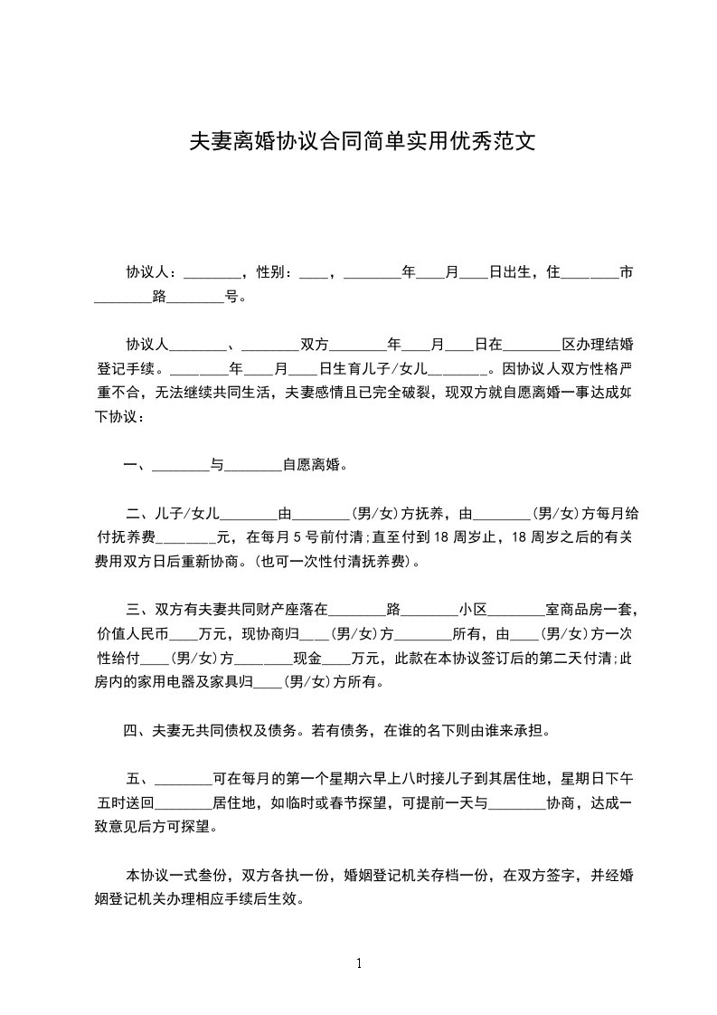 男方与女方_年_月认识,_年__月_日在登记结婚,婚后_年__月_日生育一儿子。因性格不和致使夫妻感情确已破裂,已无和好可能,现经夫妻双方自愿协商达成一致意见,订立离婚协议如下: