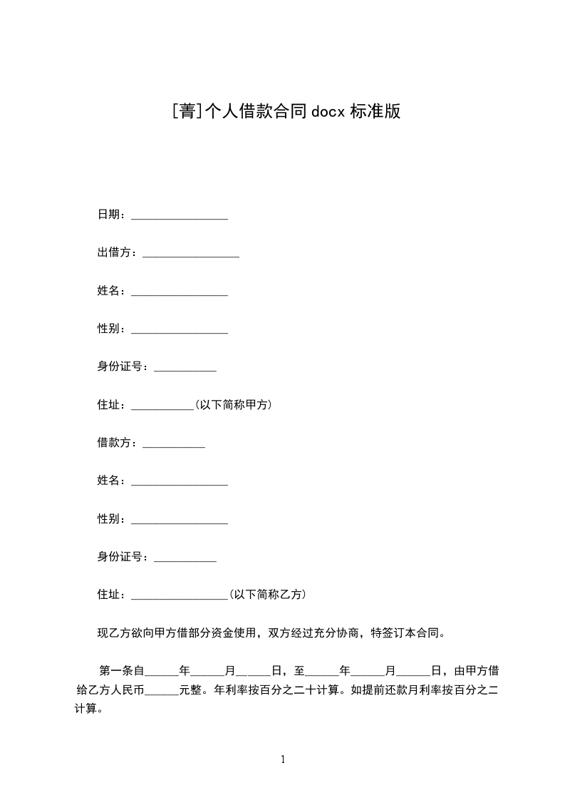第一条自______年______月______日,至______年______月______日,由甲方借给乙方人民币______元整。年利率按百分之二十计算。如提前还款月利率按百分之二计算。
