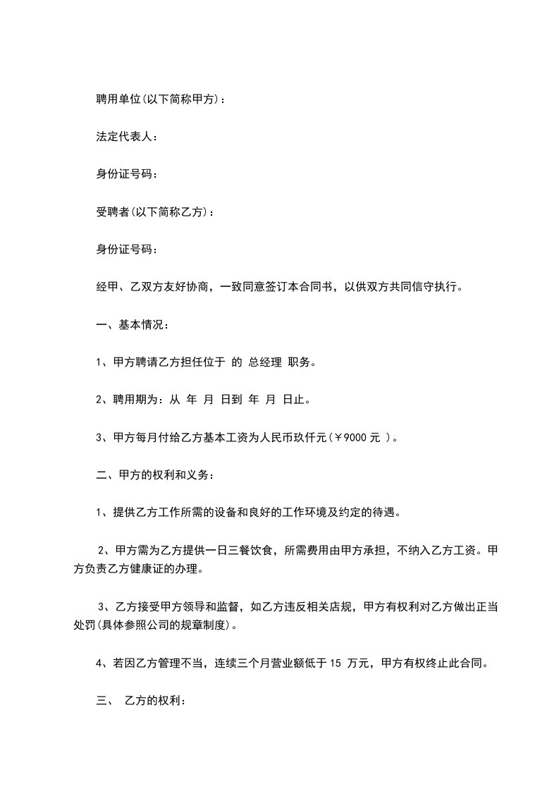 1、甲方聘请乙方担任位于 的 总经理 职务。