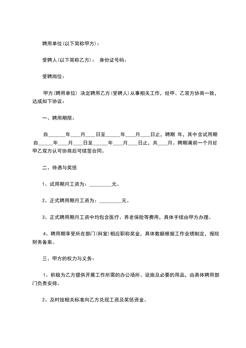 自_______年____月____日至______年____月____日止,聘期 年,其中含试用期自______年____月____日至______年____月____日止,共____月。聘期满前一个月经甲乙双方认可协商后可续签合同。