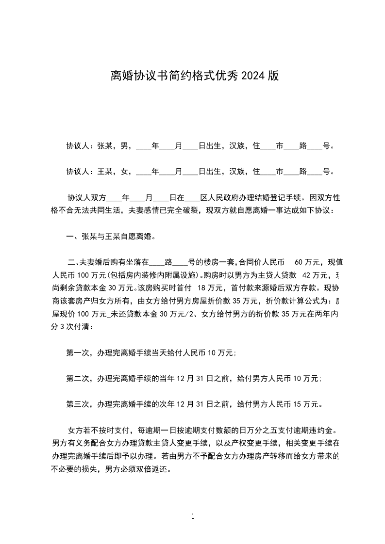 1、经双方协商同意,男方共分割给女方人民币_____元整,其中_____万元本协议生效当时支付,其余_____万元_____年_____月_____日前支付,均以女方收款凭条为证。