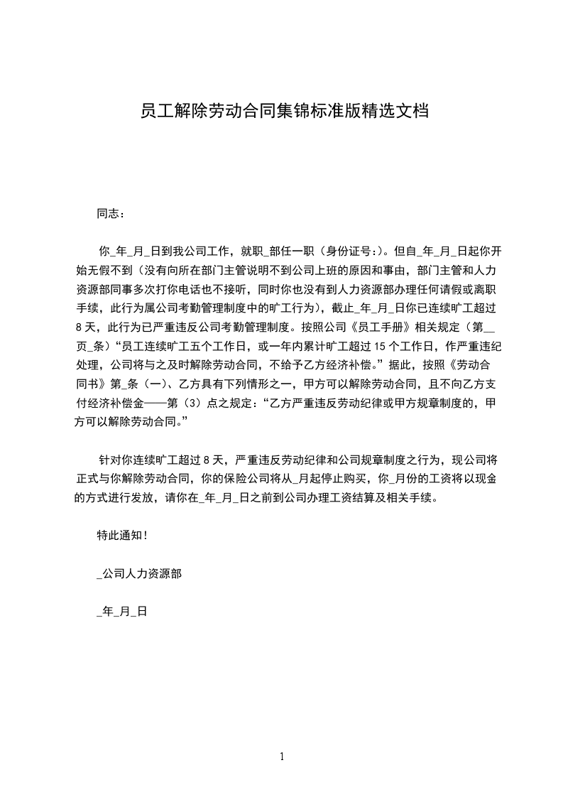 针对你以上严重违反公司规章制度的行为,且在平日工作中时常多次无故缺岗、消极怠工、上班时间睡觉等行为,现公司将正式与你违纪解除劳动合同,你_____年_____月份的工资将以现金的方式进行发放,请你在_____年_____月_____日到公司办理工资结算及相关手续。