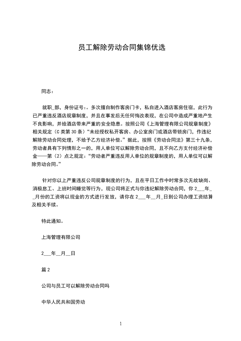 您就职____部,身份证号:____________________________。因多次擅自制作客房门卡,私自进入酒店客房住宿,此行为已严重违反酒店规章制度,并且在事发后无任何悔改表现,在公司中造成严重地产生不良影响,并给酒店带来严重的安全隐患。按照公司《上海__________管理有限公司规章制度》相关规定(C类第30条)“未经授权私开客房、办公室房门或酒店带锁房门,作违纪解除劳动合同处理,不给予乙方经济补偿。”据此,按照《劳动合同法》第三十九条,劳动者具有下列情形之一的,用人单位可以解除劳动合同,且不向乙方支付经济补偿金——第(2)点之规定:“劳动者严重违反用人单位的规章制度的,用人单位可以解除劳动合同。”