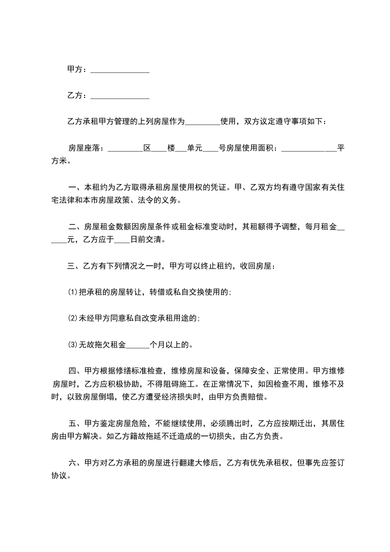 第八条:提前终止合同在房屋租赁期间,任何一方提出终止合同,需提前_____月书面通知对方,经双方协商后签订终止合同书,在终止合同书签订前,本合同仍有效。受不可抗力因素影响,甲方必须终止合同时,一般应提前_____个月书面通知乙方。乙方的经济损失甲方不予补偿。