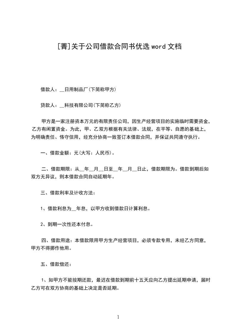 借款人:__日用制品厂贷款人:__科技有限公司