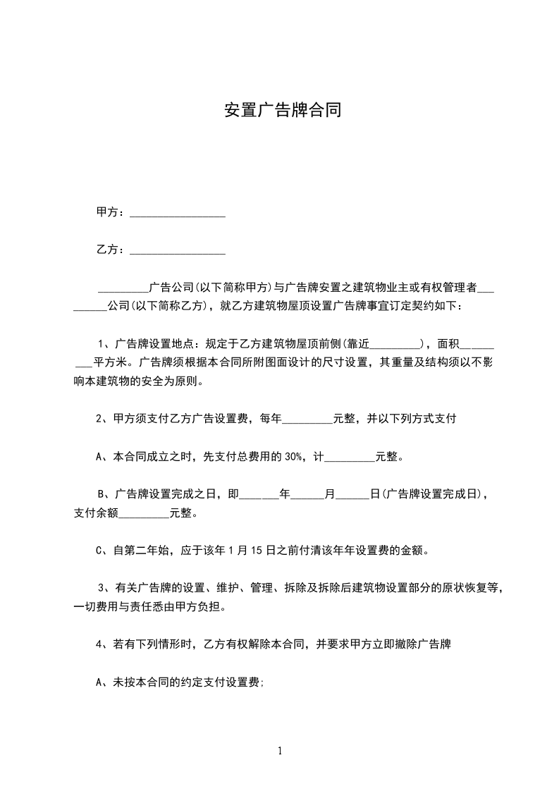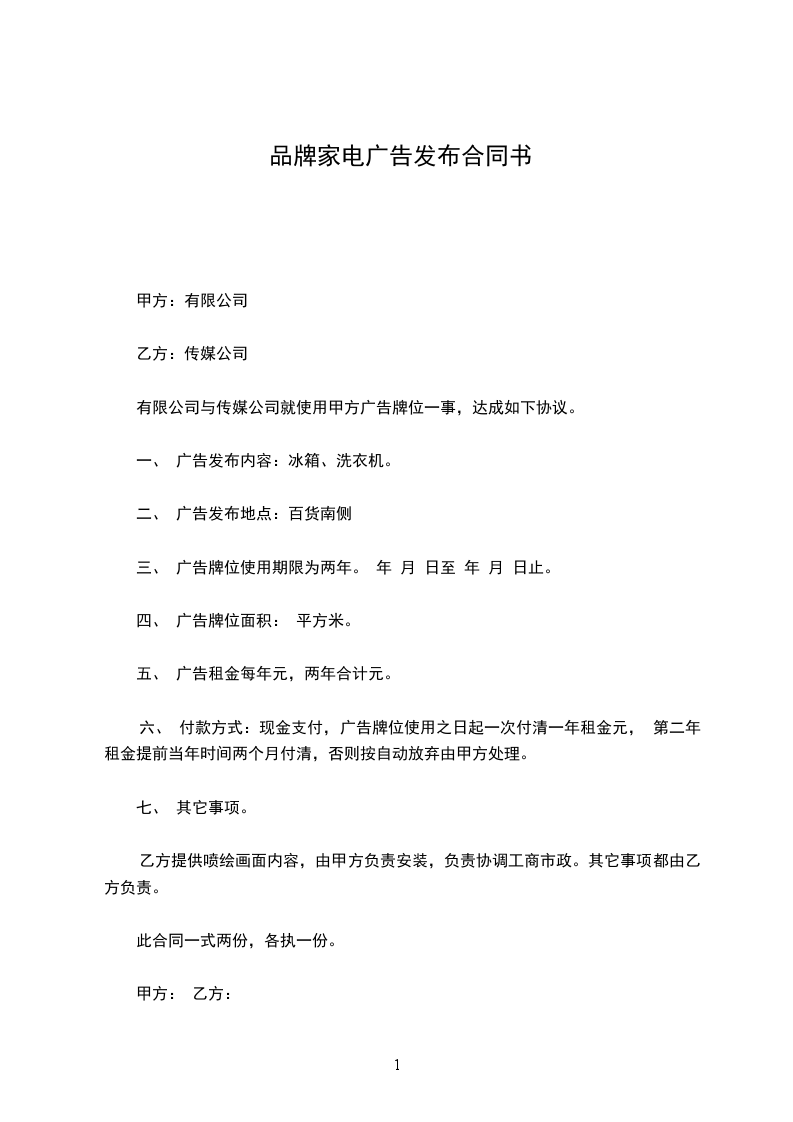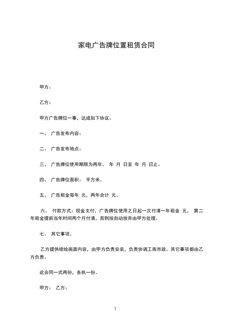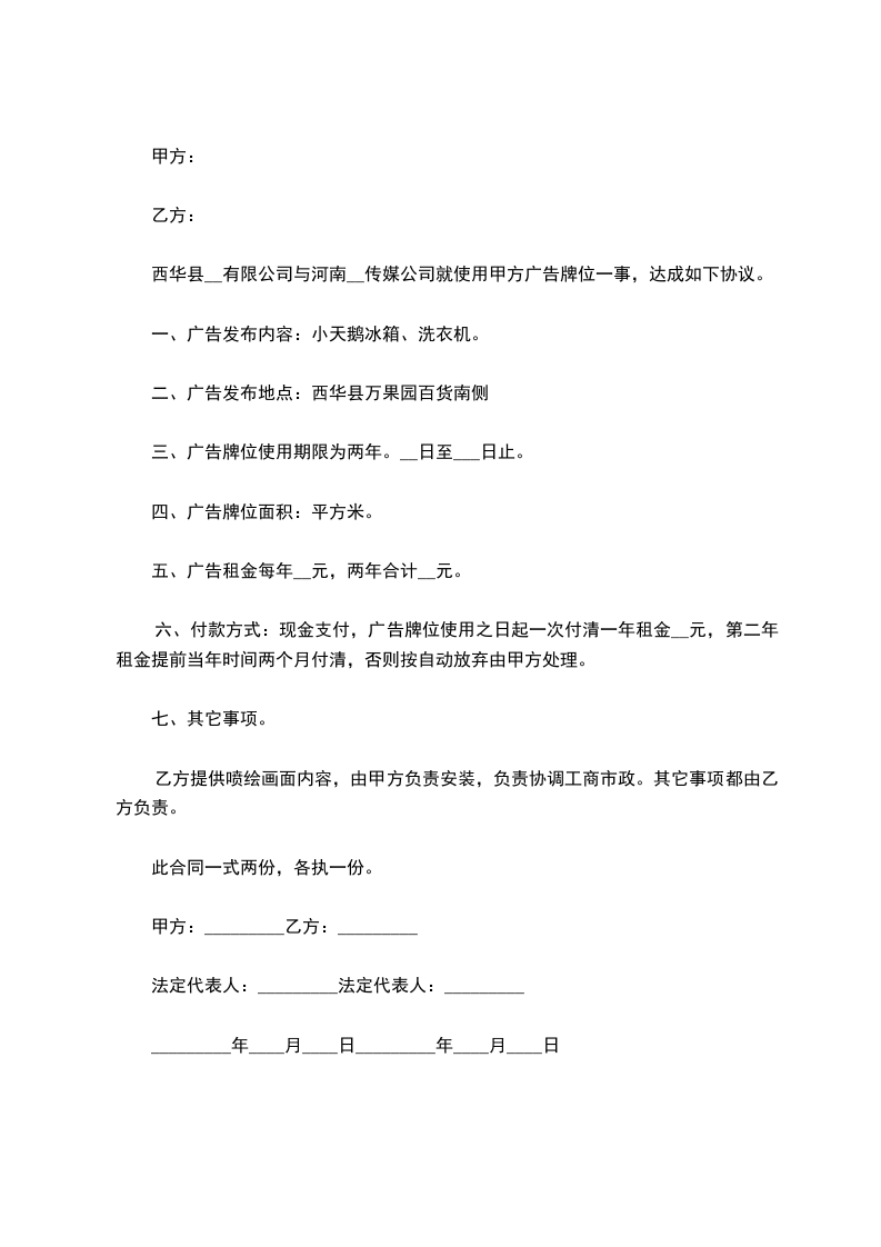 六、 付款方式:现金支付,广告牌位使用之日起一次付清一年租金 元, 第二年租金提前当年时间两个月付清,否则按自动放弃由甲方处理。