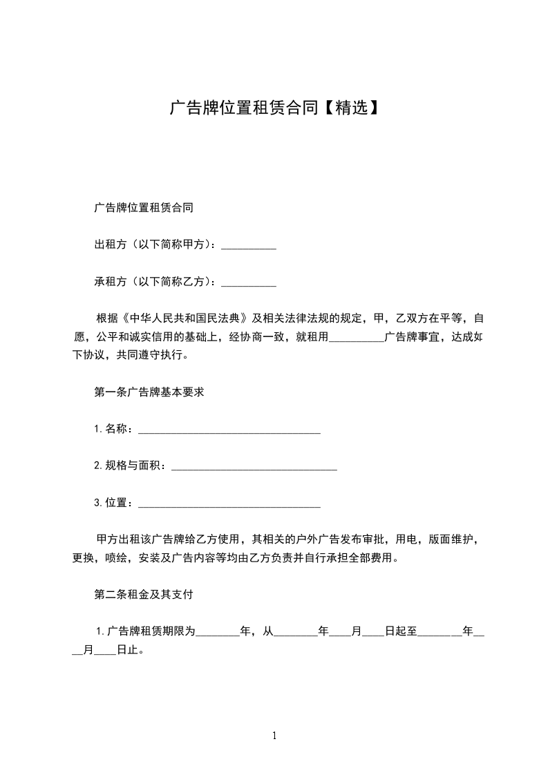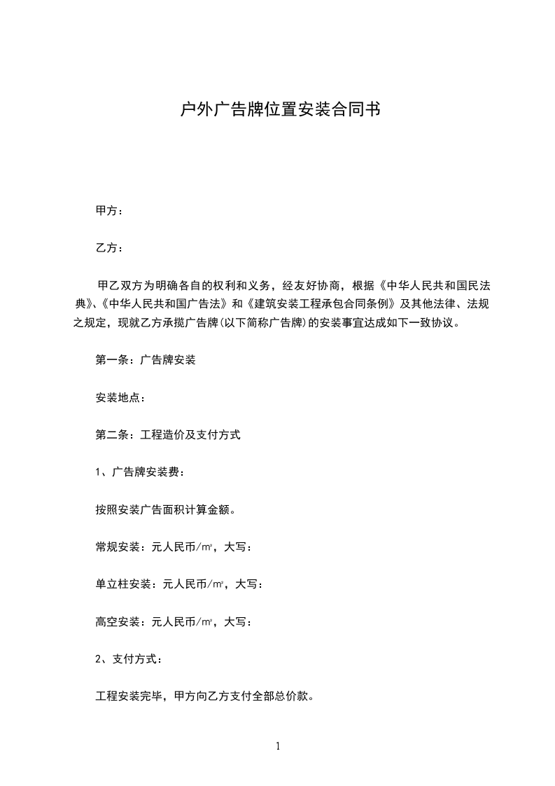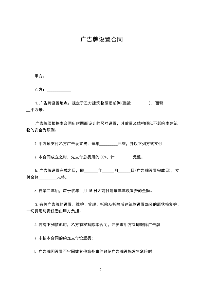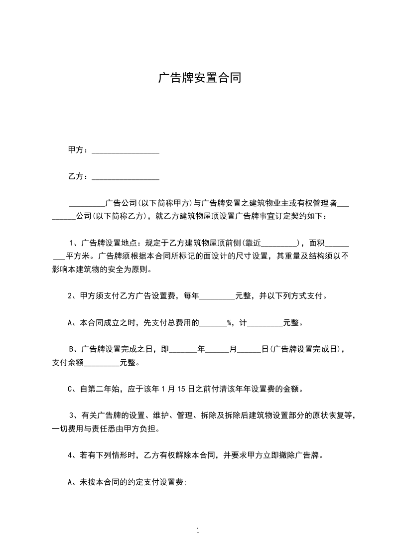 六、 付款方式:现金支付,广告牌位使用之日起一次付清一年租金 元, 第二年租金提前当年时间两个月付清,否则按自动放弃由甲方处理。