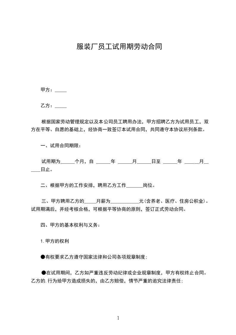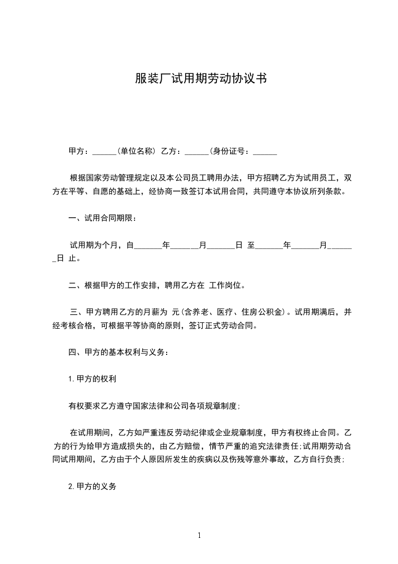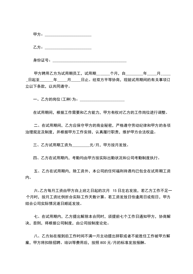甲方聘用乙方为试用期员工,试用期_______个月,自_________年_____月______日起至_______年_____月_____日止。经双方平等协商,现就试用期间的有关事项订立以下条款,以共同遵守。