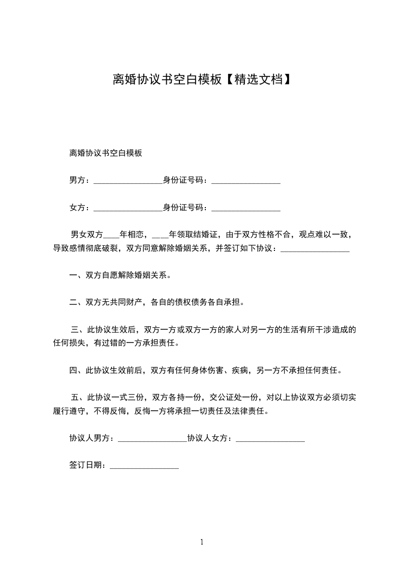 男方与女方_年_月经人介绍认识,后_年_月_日在__县民政局登记结婚。因婚前缺乏了解,婚后夫妻因性格不合而感情彻底破裂。现双方自愿协商离婚。经双方商定,对有关于离婚事宜达成以下协议: