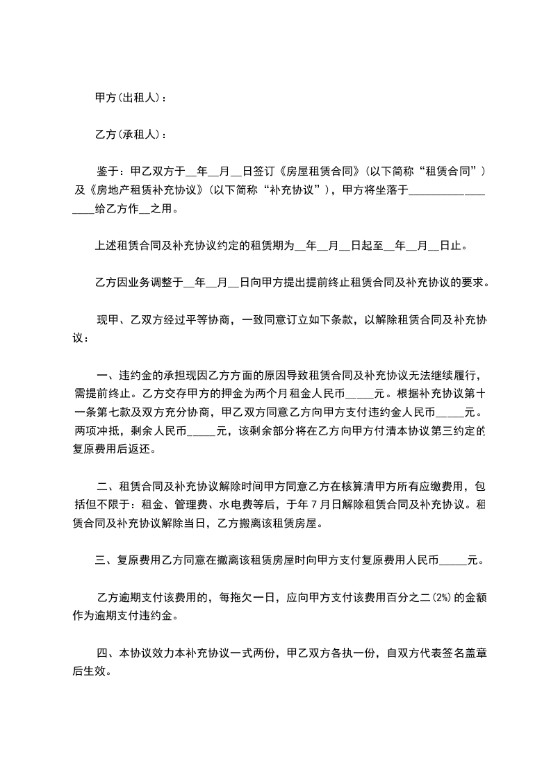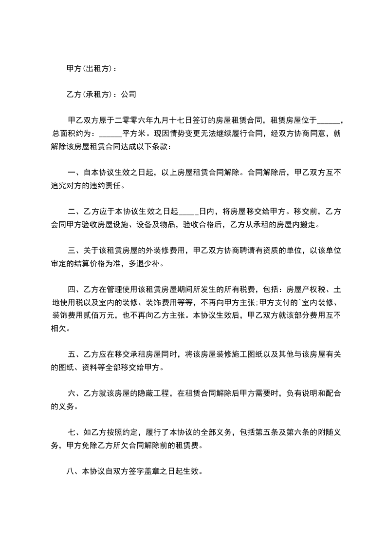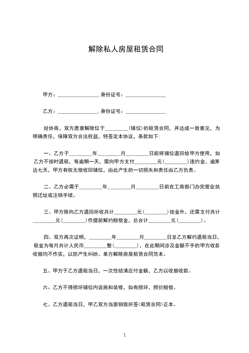 经协商,双方愿意解除位于_________(铺位)的租赁合同,并达成一致意见,为明确责任,保障双方合法权益,特签定本协议,条款如下: