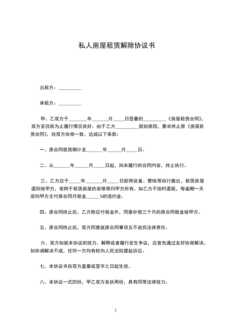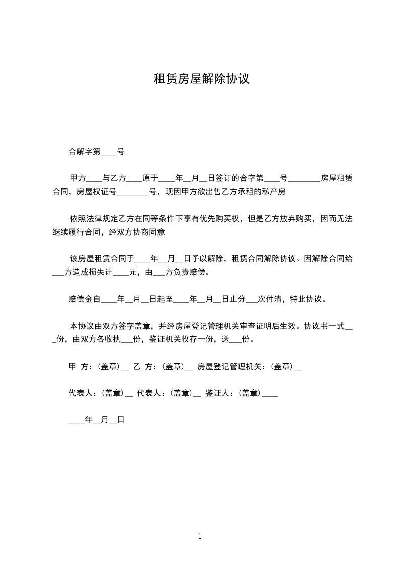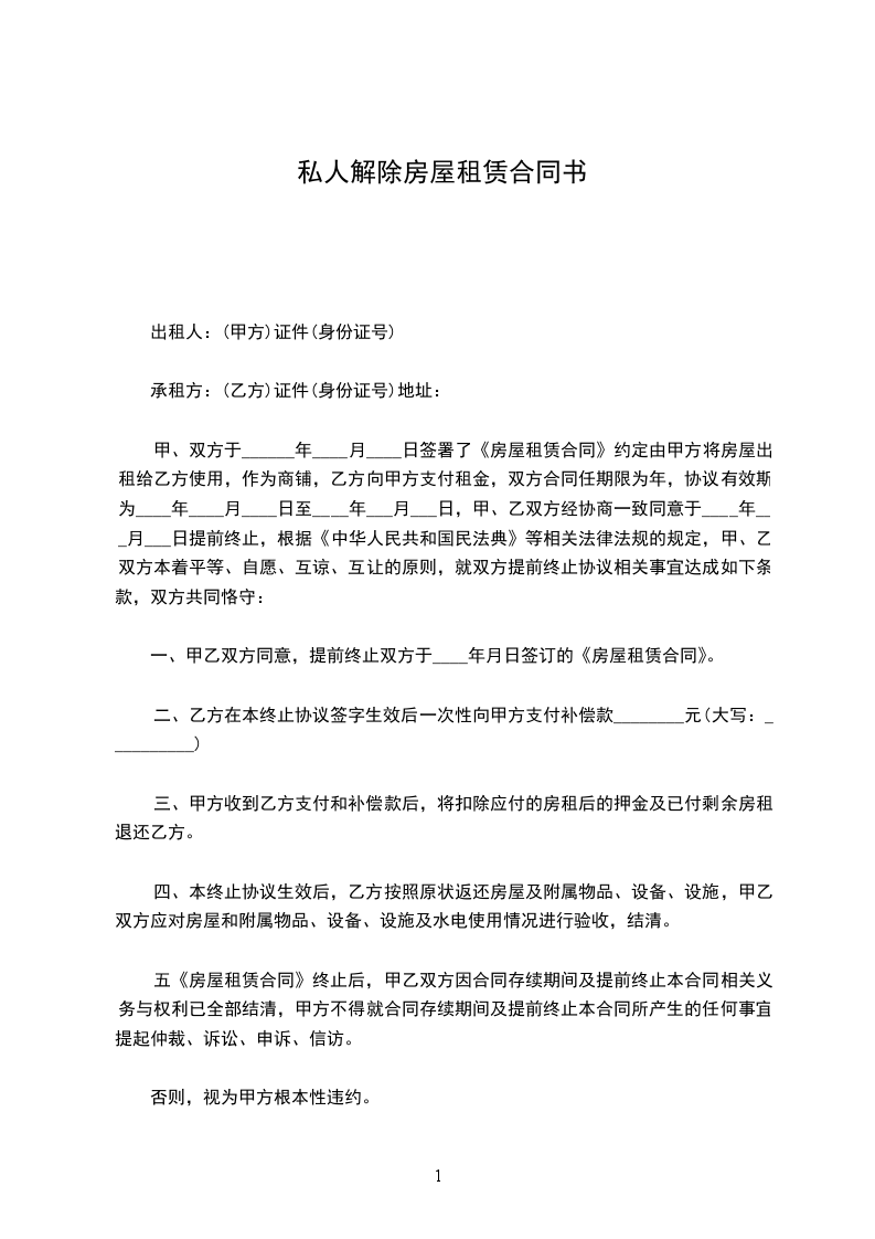 四、双方再次证明,_________年_________月_________日至乙方解约退租当日,租金为每月共计人民币_________整(_________),在此期间涉及金额不乎的甲方收款收据均不作实,以防产生纠纷。单方解除房屋租赁合同范本。