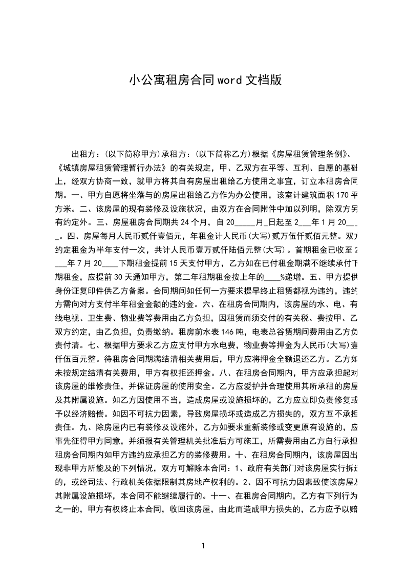 一、甲方自愿将坐落与的房屋出租给乙方作为办公使用,该室计建筑面积170平方米。