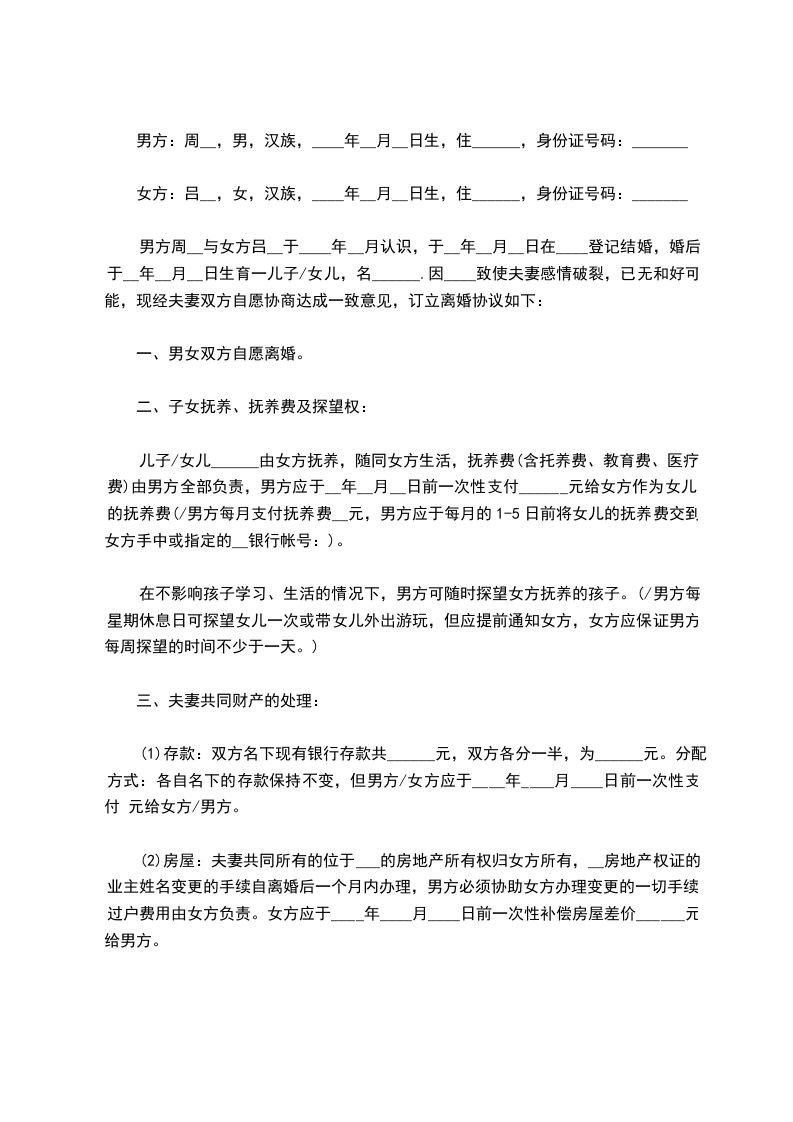 男方与女方_年_月认识,_年__月_日在登记结婚,婚后_年__月_日生育一儿子/女儿,名。因夫妻感情破裂,已无和好可能,现经夫妻双方自愿协商达成一致意见,订立离婚协议如下: