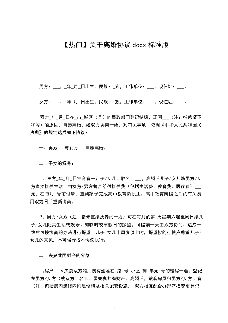 双方当事人:男方:,年龄:,民族:,职业:,身份证号码:住址:。女方:,年龄:,民族:,职业:,身份证号码:住址:。经商定,达成以下自愿离婚协议:一、双方自愿离婚男方与女方_年__月_日在民政部门登记结婚。现因夫妻感情彻底破裂,双方自愿离婚。