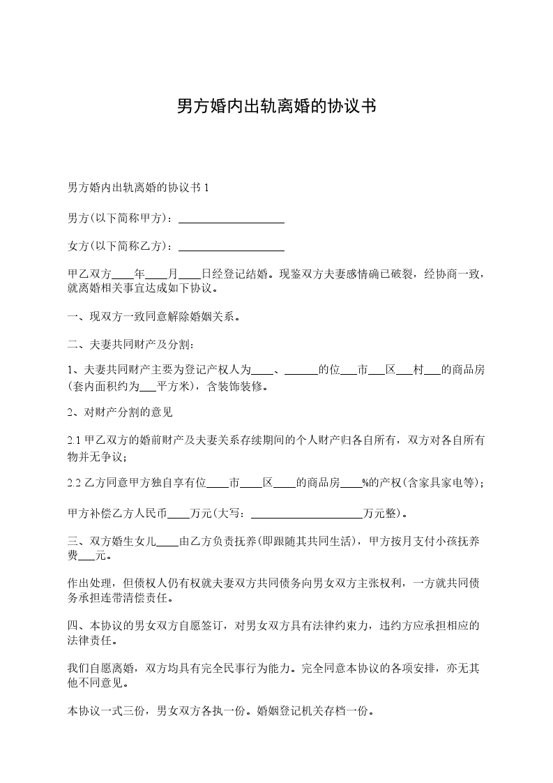 男方婚内出轨离婚的协议书男方:____,男,汉族,_____年___月___日生,住____________,身份证号码:_______________