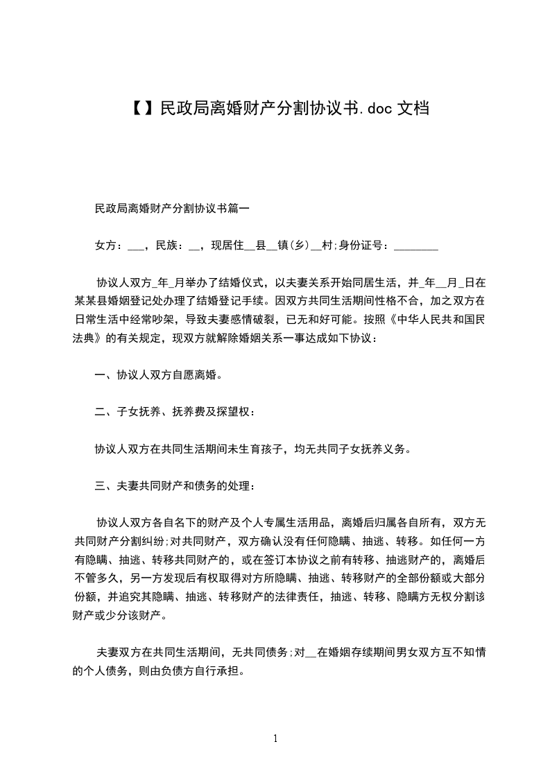 民政局离婚财产分割协议书篇一