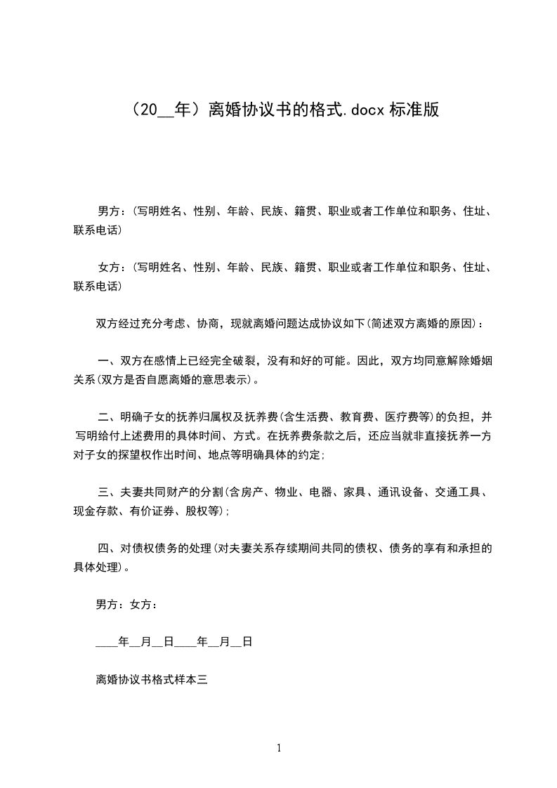 本协议一式三份,自签订之日起生效,男、女双方各执一份,婚姻登记机关存档一份。